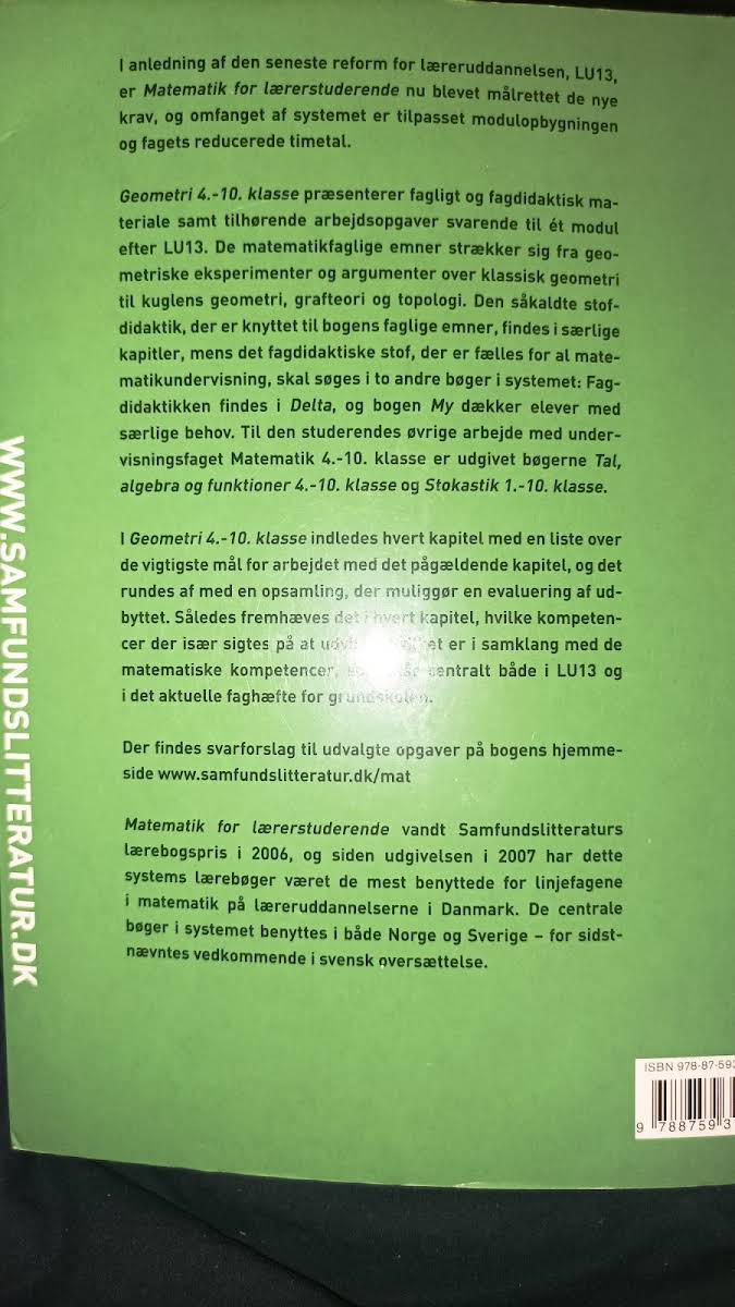 "Matematik for lærerstuderende – Geometri" er udarbejdet i lyset af den seneste reform af læreruddannelsen og imødekommer de nye krav til undervisningen i geometri for 4.–10. klasse. Bogen, udgivet af Samfundslitteratur i 2013, tilbyder lærerstuderende et solidt fagligt fundament kombineret med fagdidaktisk materiale og tilhørende arbejdsopgaver svarende til ét modul efter LU13. De matematikfaglige emner spænder fra geometriske eksperimenter og argumentation om måling og areal til praktiske opgaver med flytninger, tegning og udformning af symmetriske mønstre. Særligt udvalgte kapitler fokuserer på stofdidaktikken og understøtter den videre forståelse af geometriens centrale begreber, hvilket gør bogen til et uundværligt redskab for kommende lærere.