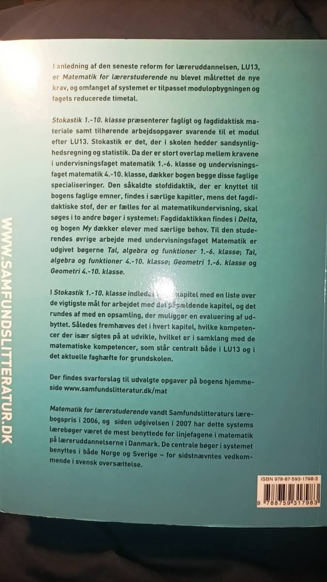 Opdateret i takt med de seneste ændringer i læreruddannelsen byder Matematik for lærerstuderende – Stokastik på et spændende redskab for kommende matematiklærere. Bogen præsenterer et nøje udvalgt fagligt og didaktisk materiale, der svarer til ét modul efter LU13, med særlig fokus på de områder, der i skolen kaldes sandsynlighedsregning og statistik. I arbejdet med stokastik har forfatterne John Schou, Hans-Christian Hansen, Kristine Jess og Jeppe Skott sat ind på både de teoretiske og praktiske problemstillinger, som du møder i undervisningen i matematik for 1.-6. og 4.-10. klasse. Med sine 200 sider er denne paperback et oplagt hjælpemiddel for både den studerende og den praktiserende lærer, der ønsker et solidt udgangspunkt for undervisningen i stokastik.