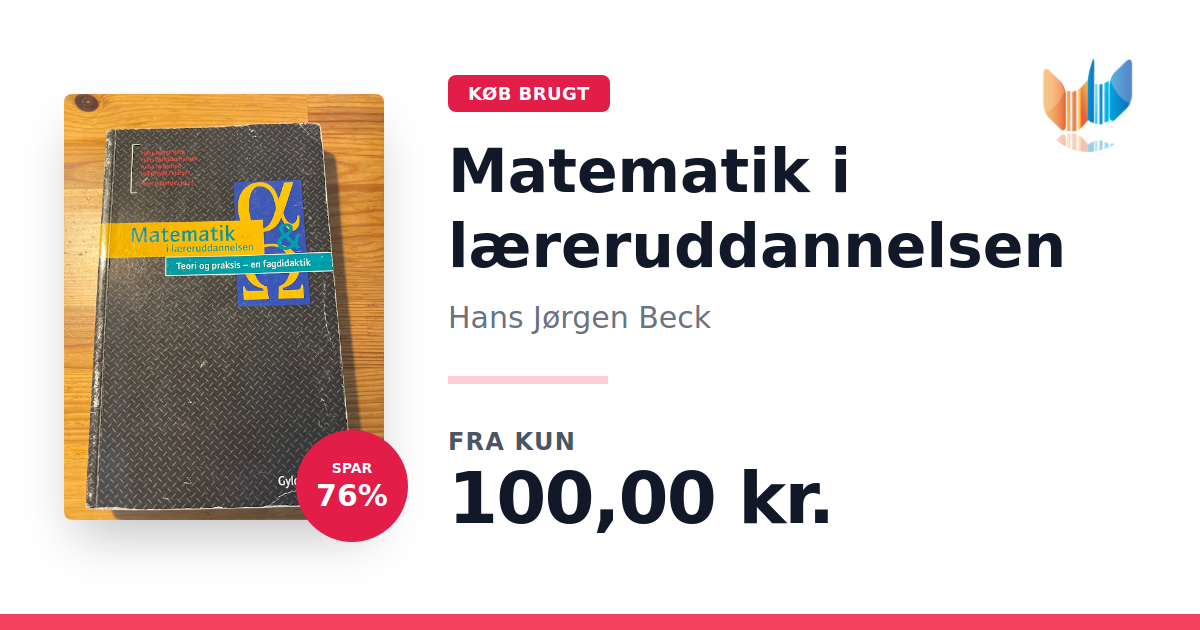 Lige nu kan du købe "Matematik i læreruddannelsen" af Hans Jørgen Beck til kun 100,00 kr. Du sparer hele 76% af nyprisen! Bogen du ser her er brugt, og i god stand. Vi har i øjeblikket 3 eksemplarer til salg af "Matematik i læreruddannelsen", så husk at se de forskellige udgaver.