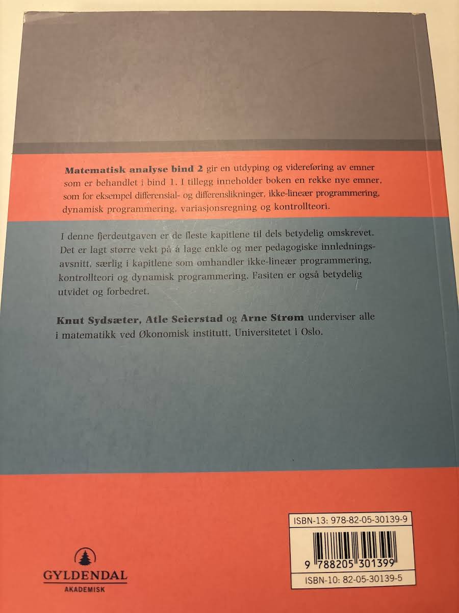 Matematisk analyse. Bd.2 (4. utg.) utvider og fordyper de grunnleggende emnene fra første bind. I denne utgaven fortsetter Knut Sydsaeter å utforske sentrale aspekter av matematisk analyse, med en rekke nye temaer som differensial- og differensiallikninger, ikke-lineær programmering, dynamisk programmering, variasjonsregning og kontrollteori. Boken er nøye revidert og pedagogisk fornyet i denne fjerdeutgaven, der innledende avsnitt er utformet for å gjøre tilnærmingen til komplekse konsepter enklere å forstå. Med et utvidet og forbedret utvalg av fasitoppgaver, legger denne boken et solid grunnlag for videre studier innen matematisk analyse.