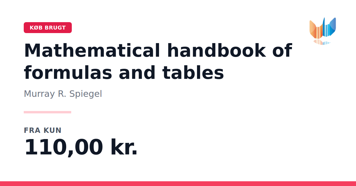Lige nu kan du købe "Mathematical handbook of formulas and tables" af Murray R. Spiegel til kun 110,00 kr. Du sparer hele 12% af nyprisen! Bogen du ser her er brugt, og i perfekt stand. Vi har i øjeblikket 3 eksemplarer til salg af "Mathematical handbook of formulas and tables", så husk at se de forskellige udgaver.