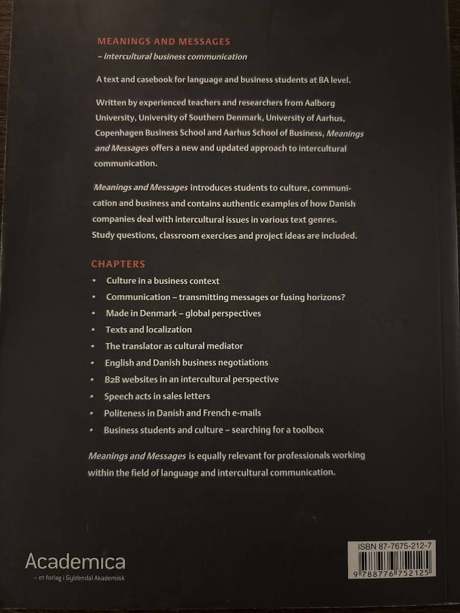 Meanings and Messages er en lærebog og casebog, udarbejdet til studerende inden for sprog og forretning på bachelorniveau. Bogen byder på en opdateret tilgang til interkulturel kommunikation og præsenterer både teoretiske perspektiver og autentiske eksempler fra danske virksomheder. Gennem bogen introduceres centrale temaer som kultur, kommunikation og forretningsstrategier i en global kontekst. Med inddragelse af studie spørgsmål, klasseøvelser og projektidéer understøttes den faglige refleksion og diskussion om, hvordan interkulturelle udfordringer håndteres i praksis. Kapiteloverskrifterne omfatter emner som Culture in a business context; Communication - transmitting messages or fusing horizons?; Made in Denmark – global perspectives; Texts and localization; The translator as cultural mediator; English and Danish business negotiations; B2B Websites in an intercultural perspective; Speech acts in sales letters; Politeness in Danish and French e-mails; samt Business students and culture – searching for a toolbox. Med sin brede dækning af interkulturel kommunikation er Meanings and Messages et uundværligt redskab for både studerende og professionelle, der ønsker at forstå og navigere i krydsfeltet mellem sprog, kultur og forretning.