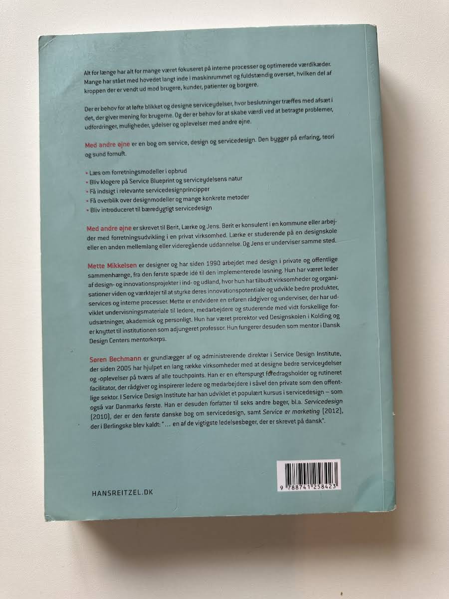 "Med andre øjne – om service, design og servicedesign" byder på et inspirerende perspektiv på, hvordan organisationer kan transformere deres tilgang til service ved at sætte brugeren i centrum. Søren Bechmann og Mette Mikkelsen understreger vigtigheden af at forstå de reelle behov og ønskemønstre hos dem, der i sidste ende står over for serviceydelsen. Bogen udfordrer den traditionelle fokus på interne processer og optimerede værdikæder og viser, hvordan en brugercentreret metode kan skabe mere meningsfulde og effektive løsninger. Gennem velgennemtænkte eksempler og beskrivelser af designprocesser præsenteres en ny logik, hvor serviceydelsens natur og fundamentale designprincipper kommer tydeligt til udtryk. Med sine 464 sider uddyber Bechmann og Mikkelsen, hvordan forretningsmodeller, servicedesign og konceptuelle rammer kan udvikles med udgangspunkt i kundens virkelighed. Bogen er et værdifuldt værktøj for alle, der ønsker at skabe innovative og bæredygtige løsninger, der afspejler brugernes udfordringer og potentialer.