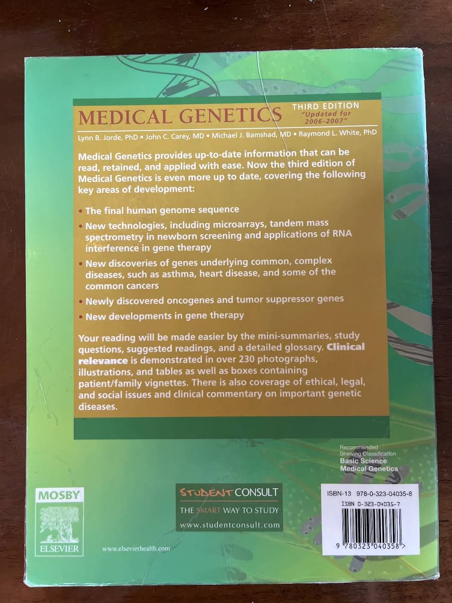 Medical Genetics af Lynn B. Jorde fra 2006 præsenterer en omfattende og ajourført gennemgang af moderne genetik. Bogen formidler de seneste resultater fra genetisk forskning og viser, hvordan denne viden kan omsættes til klinisk praksis. Læseren føres igennem både grundlæggende principper og avancerede metoder med fokus på anvendelighed i sundhedsvæsenet. Denne paperback på 392 sider dækker en bred vifte af emner fra genernes struktur til kliniske anvendelser. Værket henvender sig til medicinstuderende, biologer og kliniske fagpersoner, der ønsker en opdateret og praktisk orienteret forståelse af genetik. Medical Genetics fungerer som et solidt opslagsværk for alle, der arbejder med genetiske aspekter i medicinsk praksis.