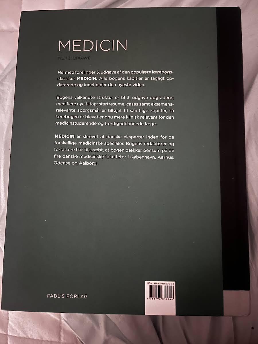 Hermed præsenteres den reviderede 3. udgave af den populære lærebog "Medicin". Bogen byder på et solidt overblik over medicinske sygdomme, inddelt efter subspecialer, og alle kapitler er blevet opdateret med de nyeste retningslinjer og evidensbaseret viden. Den pædagogiske tilgang understreges af en overskuelig opbygning, hvor mange illustrationer, kliniske fotos, tabeller, bokse, spørgsmål/svar og cases gør stoffet mere tilgængeligt og studievenligt. "Medicin" er designet til at støtte den studerendes læring gennem hele medicinstudiet – fra de første kliniske møder til den afsluttende eksamen – og fungerer samtidig som et værdifuldt opslagsværk for praktiserende læger. Bogens forfattere og redaktører er alle erfarne eksperter inden for deres respektive medicinske specialer og bidrager med en indsigt, som afspejler den undervisning, den medicinstuderende vil møde gennem hele uddannelsen.