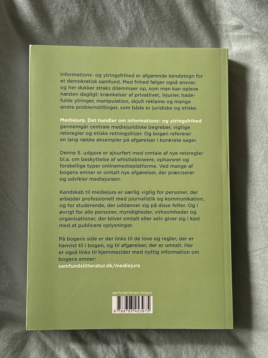 Mediejura: Det handler om informations- og ytringsfrihed giver et solidt indblik i de juridiske og etiske aspekter, som følger med den grundlæggende frihed til at dele informationer. Bogen gennemgår centrale mediejuridiske begreber, vigtige retsregler og etiske retningslinjer, der belyser dilemmaerne i et moderne demokratisk samfund. I den 5. udgave, udgivet af Ajour i 2022, finder du opdateret omtale af nye retsregler inden for områder som beskyttelse af whistleblowere, ophavsret og regulering af online medieplatforme. Med et vægt på nye afgørelser, der præciserer mediejuraen, formår forfatterne at sætte fokus på de aktuelle udfordringer, som både professionelle og studerende inden for journalistik og kommunikation står overfor. Denne bog er et uundværligt værktøj for alle, der beskæftiger sig med publicering af oplysninger, uanset om det er som del af det offentlige rum, i organisationer eller i private sammenhænge. Desuden giver de mange henvisninger til lovtekster og afgørelser læseren mulighed for at fordybe sig yderligere i emnets kompleksitet.