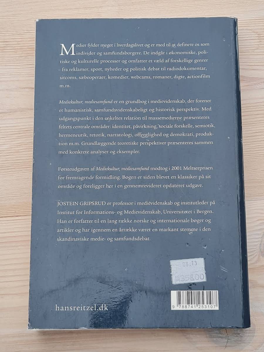 I Mediekultur, mediesamfund udforsker Jostein Gripsrud, professor i medievidenskab, hvordan medier former vores identitet og bidrager til den kulturelle, politiske og økonomiske dynamik i samfundet. Bogen samler humanistiske, samfundsvidenskabelige og historiske perspektiver og giver læseren et solidt teoretisk fundament for at forstå samspillet mellem individer og massemedier. Med udgangspunkt i analyser af identitet, påvirkning, sociale skel og de mange genrer, der fylder vores hverdag, præsenteres centrale emner såsom semiotik, hermeneutik, retorik, narratologi, offentlighed og demokrati. Gennem konkrete eksempler og teoretiske indsigter bliver det tydeligt, hvordan medievidenskaben spejler den komplekse virkelighed, som medier udgør for samtidens samfund.