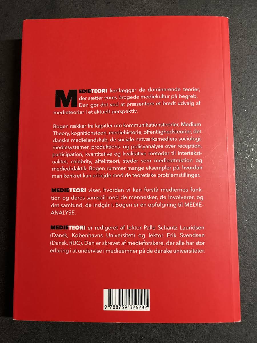 Medieteori præsenterer en omfattende gennemgang af de vigtigste teorier, som belyser mediekulturens mangfoldige udtryk. Bogen indfanger et bredt udvalg af medieteorier og sætter disse i et aktuelt perspektiv. Gennem kapitler, der spænder fra kommunikationsteorier, Medium Theory og kognitionsteori til mediehistorie og offentlighedsteorier, tager bogen fat på de komplekse processer, der former vores medielandskab. Den omfatter desuden analyser af det danske medielandskab, de sociale netværksmediers sociologi, mediesystemer samt produktions- og policyanalyse og runder af med diskussioner om reception, participation, intertekstualitet, celebrity, affektteori, medieattraktion og mediedidaktik. Med konkrete eksempler illustrerer Medieteori, hvordan teoretiske problemstillinger kan omsættes til praksis, og hvordan mediers indflydelse og samspil med både individer og samfund kan forstås. Udgivet af Samfundslitteratur i 2018 og forfattet af Palle Schantz Lauridsen, er bogen et væsentligt redskab for alle, der ønsker et dybere indblik i medieteoretiske spørgsmål.