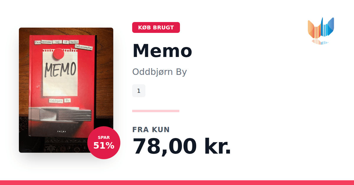 Lige nu kan du købe "Memo" af Oddbjørn By til kun 78,00 kr. Du sparer hele 51% af nyprisen! Bogen du ser her er brugt, og i perfekt stand. Vi har i øjeblikket 2 eksemplarer til salg af "Memo", så husk at se de forskellige udgaver.