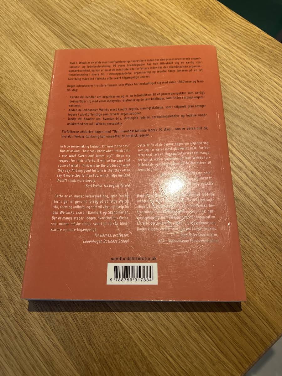 Med "Meningsskabelse, organisering og ledelse – En introduktion til Weicks univers" præsenterer James Høpner og Sverri Hammer en indsigtsfuld introduktion til de centrale ideer, som Karl E. Weick har udviklet gennem sin karriere. Bogen tilbyder en dybdegående undersøgelse af, hvordan moderne organisationer skaber mening, og hvordan de processuelle relationer samt løst koblede systemer former vores måde at organisere os på. I den første del af værket kastes der lys over et procesperspektiv, der fokuserer på indbyrdes relationer og de fleksible strukturer, der kendetegner nutidens organisationer. Herefter uddybes temaet meningsskabelse – et af Weicks mest kendte bidrag til samfundsvidenskaben – med fokus på, hvordan vi fortolker og navigerer i en verden under konstant forandring. Afslutningsvis undersøger bogen ledelsespraksisser set ud fra et Weick-inspireret perspektiv, og giver dermed et unikt indblik i, hvordan strategisk ledelse og forandringsledelse kan forstås og praktiseres. Udgivet af Samfundslitteratur i 2014 i paperback tilbyder denne bog et solidt teoretisk fundament for alle, der ønsker at fordybe sig i dynamikken mellem meningsskabelse, organisering og ledelse.