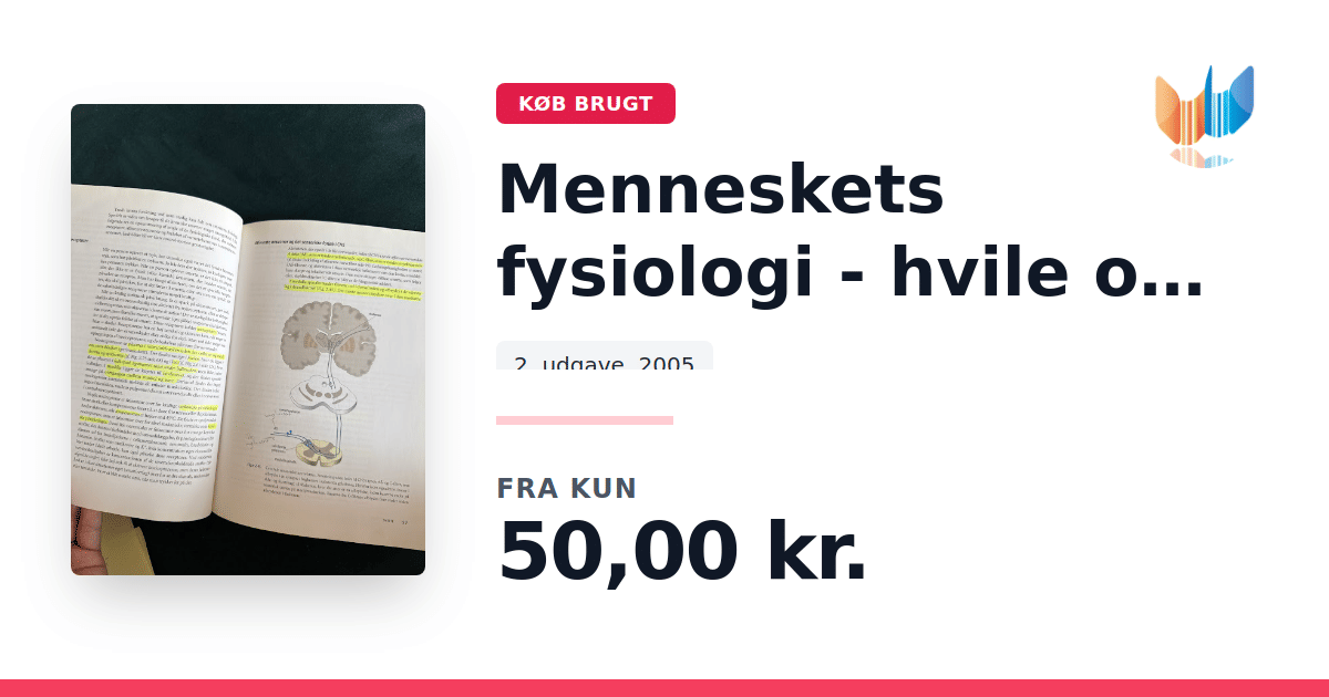 Lige nu kan du købe "Menneskets fysiologi - hvile og arbejde" til kun 50,00 kr. Bogen du ser her er brugt, og i slidt stand. Vi har i øjeblikket 2 eksemplarer til salg af "Menneskets fysiologi - hvile og arbejde", så husk at se de forskellige udgaver.
