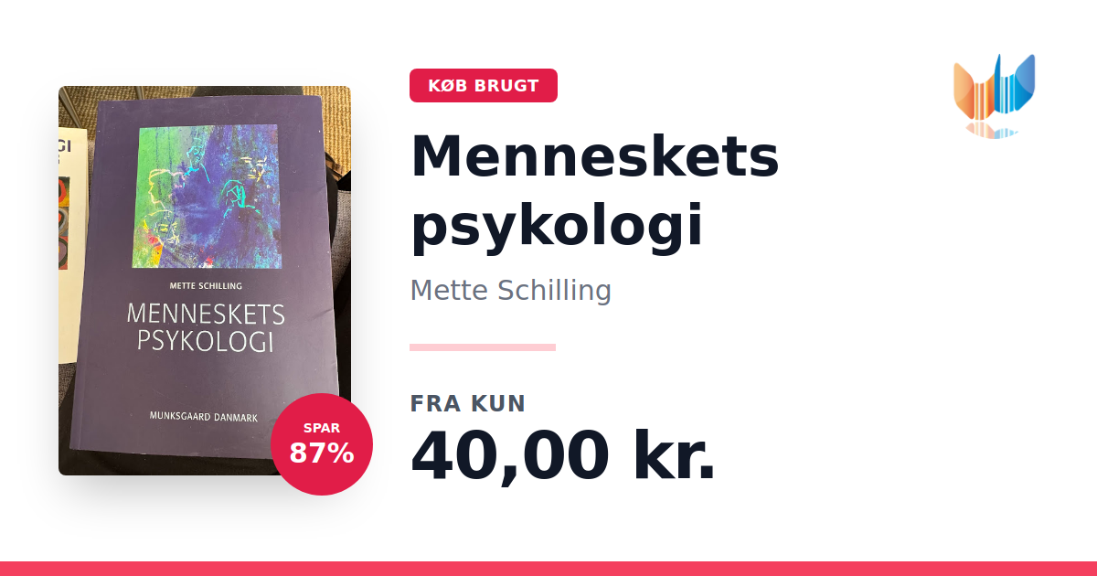 Lige nu kan du købe "Menneskets psykologi" af Mette Schilling til kun 40,00 kr. Du sparer hele 87% af nyprisen! Bogen du ser her er brugt, og i god stand. Vi har i øjeblikket 2 eksemplarer til salg af "Menneskets psykologi", så husk at se de forskellige udgaver.