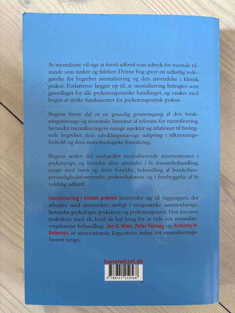 Bogen "Mentalisering i klinisk praksis" giver en dybdegående introduktion til, hvordan evnen til at forstå adfærd ud fra underliggende mentale tilstande – såsom tanker og følelser – kan forankres i en terapeutisk kontekst. Forfatterne Jon G. Allen, Peter Fonagy og Anthony Bateman samler deres ekspertise for at definere mentalisering som fundamentet for psykoterapeutiske handlinger, og de klargør, hvordan denne tilgang kan anvendes til at styrke klinisk praksis. I den første del gennemgås den omfattende forskningsmæssige og teoretiske litteratur, der belyser mentaliseringens neurobiologiske forankring og dens udviklingsmæssige udspring i tilknytningsforhold. Den anden del fokuserer på konkrete mentaliserende interventioner, der anvendes i behandlingen af diverse udfordringer, såsom traumer, relationel terapi med børn og forældre samt behandling af borderline-personlighedsforstyrrelse. Med et solidt fagligt fundament henvender bogen sig til alle, der arbejder med psykoterapeutisk praksis, herunder psykologer, psykiatere og psykoterapeuter.