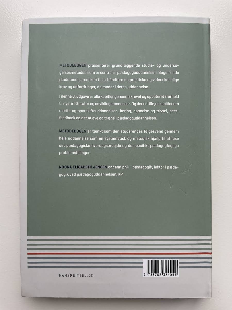 Metodebogen: Studie- og undersøgelsesmetoder på pædagoguddannelsen giver en systematisk indføring i de væsentligste metoder, du møder gennem dit studie. Denne 3. udgave fra 2023 er grundigt gennemskrevet og ajourført med nyeste litteratur og udviklingstendenser. Der er tilføjet kapitler om merit- og sporskifteuddannelser, læring, dannelse og trivsel samt om peer-feedback og øvelsespraksis. Bogen fungerer som et praktisk redskab til at håndtere både de faglige og videnskabelige krav, du møder undervejs på pædagoguddannelsen. Den følger dig fra de første studieseminarer til specialet og hjælper dig med at læse og analysere pædagogisk hverdagsarbejde og komplekse pædagogfaglige problemstillinger. Hvert kapitel afsluttes med et diskussionsafsnit, der præsenterer alternative vinkler på de gennemgåede emner. Disse refleksionsøvelser kan med fordel anvendes i studiegrupper eller som forberedelse til undervisning og eksamen, hvor de bidrager til kritisk tænkning og dybere forståelse. Som supplement rummer Metodebogen en ordliste med centrale fagbegreber sat ind i en pædagoguddannelseskontekst. Forfatteren Noona Elisabeth Jensen er cand.phil. i pædagogik og lektor ved pædagoguddannelsen på KP.