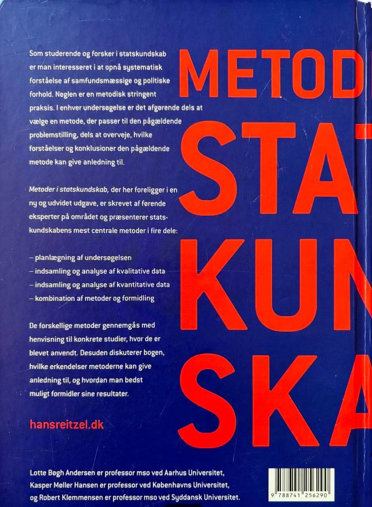 "Metoder i statskundskab" er en grundigt opdateret og udvidet introduktion til de centrale metoder, der anvendes inden for statskundskab. Bogen henvender sig til studerende og forskere, der søger at opnå en dybdegående og systematisk forståelse af, hvordan man planlægger og gennemfører en vellykket undersøgelse af samfunds- og politiske forhold. I værket præsenteres de mest udbredte metoder fordelt på fire centrale områder: planlægning af undersøgelsen, indsamling og analyse af kvalitative data, indsamling og analyse af kvantitative data samt vejen fra analyse til et færdigt produkt. Hvert afsnit belyser metodernes styrker og begrænsninger med henvisninger til konkrete studier, der illustrerer de teoretiske og praktiske overvejelser bag dem. Med bidrag fra førende eksperter på området, demonstrerer bogen, hvordan man bedst vælger den rette metode til en given problemstilling, samt hvordan de opnåede erkendelser kan omsættes til formidling af valide og velunderbyggede resultater. Med sine 512 sider tilbyder "Metoder i statskundskab" et uvurderligt redskab til alle, der ønsker at mestre den metodiske tilgang inden for statskundskaben.