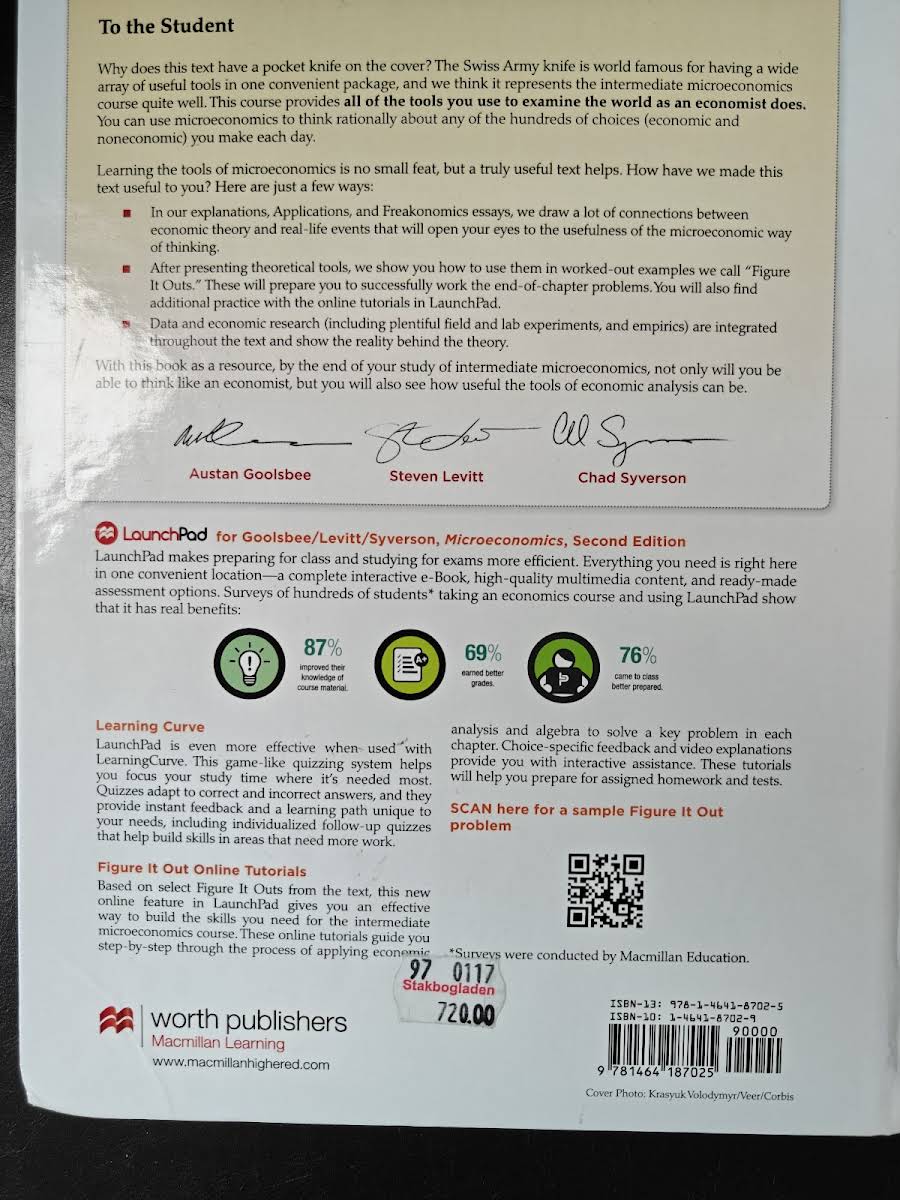 Microeconomics af Austan Goolsbee, Steven Levitt og Chad Syverson forener teori og praksis med et stærkt empirisk fokus og levende eksempler, der lader studerende teste økonomiske modeller og anvende dem i virkelige beslutningssituationer. Bogen stiller to afgørende spørgsmål: Handler folk og virksomheder virkelig, som teorien forudsiger? Og hvordan kan mikroøkonomi bruges i praksis? Hvert kapitel er nøje struktureret med illustrative cases og dynamiske figurer, der viser, hvordan teorien omsættes til analyser af markedsmæssige udfordringer. Den empiriske tilgang giver mulighed for at sammenligne antagelser med konkrete data, så læseren får et dybere indblik i mikroøkonomiens mekanismer. Som supplement til lærebogen indeholder LaunchPad en interaktiv e-bog med videoer, applets og manipulerbare visualiseringer samt LearningCurve-quizzer, der via adaptive algoritmer tilpasser sig den enkeltes niveau og tilbyder målrettet feedback. Med præbyggede undervisningsmoduler og overskuelige analyseredskaber får både undervisere og studerende et effektivt værktøj til at bygge, gennemføre og følge mikroøkonomikurser.