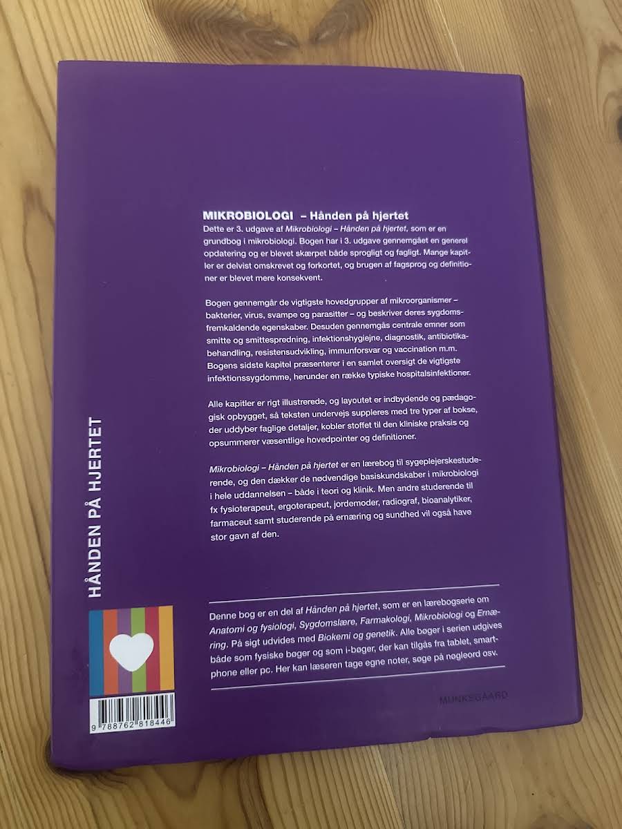 I 3. udgave af Mikrobiologi – Hånden på hjertet er grundbogen i mikrobiologi blevet gennemgået med en omfattende faglig og sproglig opdatering. Mange kapitler er revideret, forkortet og tilpasset med et mere konsekvent fagsprog, så læseren oplever en strømlinet og moderne tilgang til stoffet. Bogen dykker ned i de væsentligste mikroorganismer – herunder bakterier, virus, svampe og parasitter – og belyser deres rolle i sygdomsprocesser. Centrale temaer som smitte, infektionshygiejne, diagnostik, antibiotikabehandling, resistensudvikling, immunforsvar og vaccination behandles grundigt og præcist. Med et indbydende layout, rige illustrationer og specialdesignede bokse, der både forklarer faglige detaljer, relaterer stoffet til klinisk praksis og fremhæver hovedpointer, bliver bogen en uvurderlig ressource. Den er skræddersyet til sygeplejerskestuderende, men er også relevant for studerende inden for fysioterapi, ergoterapi, jordemoder, radiografi, bioanalytik, farmaci samt ernæring og sundhed.