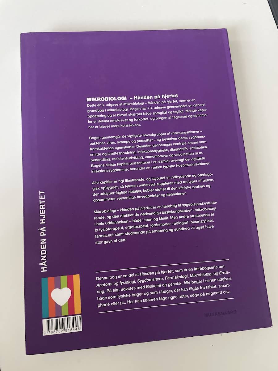 I 3. udgave af Mikrobiologi – Hånden på hjertet er grundbogen i mikrobiologi blevet gennemgået med en omfattende faglig og sproglig opdatering. Mange kapitler er revideret, forkortet og tilpasset med et mere konsekvent fagsprog, så læseren oplever en strømlinet og moderne tilgang til stoffet. Bogen dykker ned i de væsentligste mikroorganismer – herunder bakterier, virus, svampe og parasitter – og belyser deres rolle i sygdomsprocesser. Centrale temaer som smitte, infektionshygiejne, diagnostik, antibiotikabehandling, resistensudvikling, immunforsvar og vaccination behandles grundigt og præcist. Med et indbydende layout, rige illustrationer og specialdesignede bokse, der både forklarer faglige detaljer, relaterer stoffet til klinisk praksis og fremhæver hovedpointer, bliver bogen en uvurderlig ressource. Den er skræddersyet til sygeplejerskestuderende, men er også relevant for studerende inden for fysioterapi, ergoterapi, jordemoder, radiografi, bioanalytik, farmaci samt ernæring og sundhed.