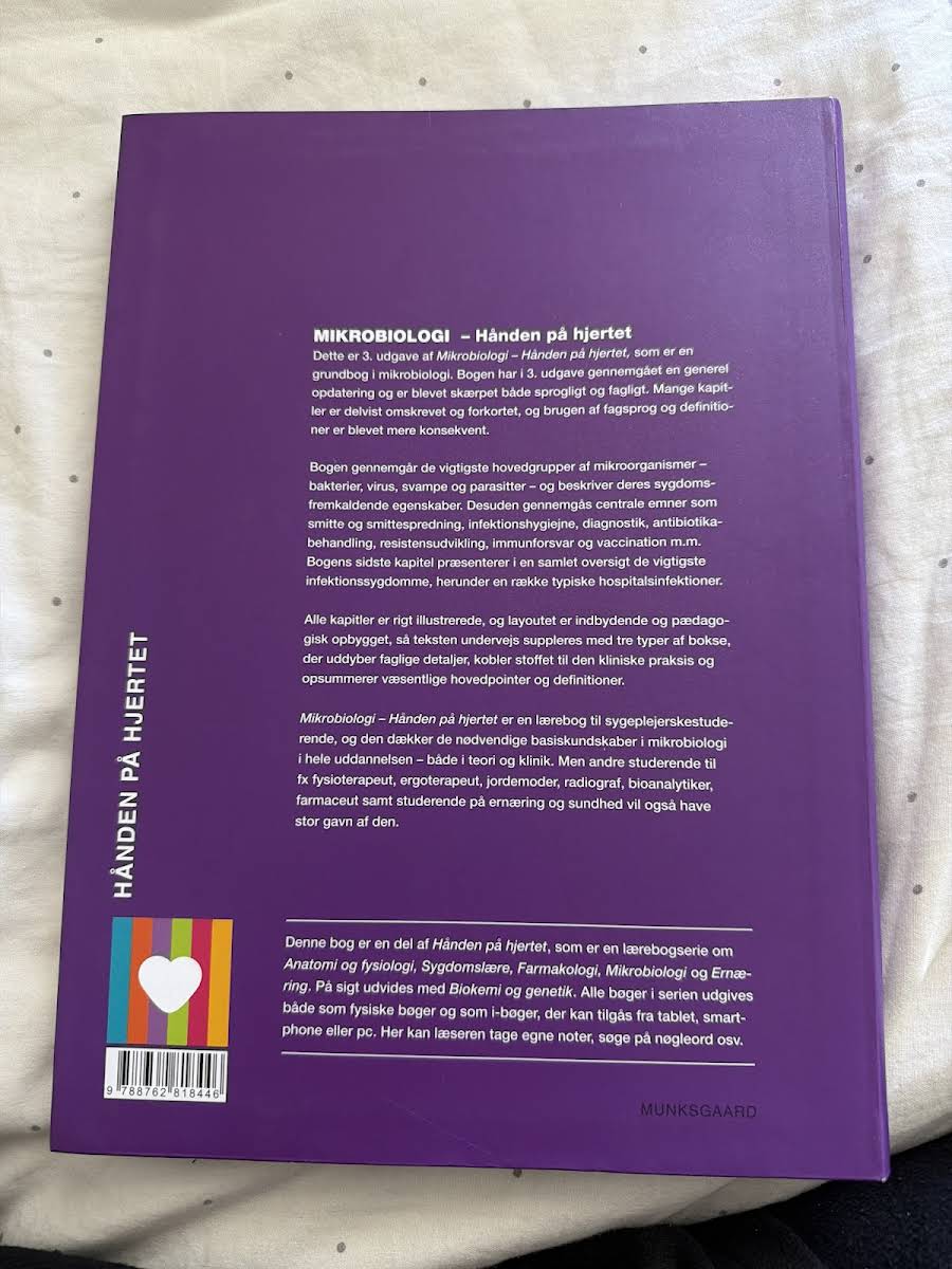 I 3. udgave af Mikrobiologi – Hånden på hjertet er grundbogen i mikrobiologi blevet gennemgået med en omfattende faglig og sproglig opdatering. Mange kapitler er revideret, forkortet og tilpasset med et mere konsekvent fagsprog, så læseren oplever en strømlinet og moderne tilgang til stoffet. Bogen dykker ned i de væsentligste mikroorganismer – herunder bakterier, virus, svampe og parasitter – og belyser deres rolle i sygdomsprocesser. Centrale temaer som smitte, infektionshygiejne, diagnostik, antibiotikabehandling, resistensudvikling, immunforsvar og vaccination behandles grundigt og præcist. Med et indbydende layout, rige illustrationer og specialdesignede bokse, der både forklarer faglige detaljer, relaterer stoffet til klinisk praksis og fremhæver hovedpointer, bliver bogen en uvurderlig ressource. Den er skræddersyet til sygeplejerskestuderende, men er også relevant for studerende inden for fysioterapi, ergoterapi, jordemoder, radiografi, bioanalytik, farmaci samt ernæring og sundhed.