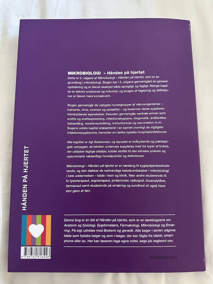 I 3. udgave af Mikrobiologi – Hånden på hjertet er grundbogen i mikrobiologi blevet gennemgået med en omfattende faglig og sproglig opdatering. Mange kapitler er revideret, forkortet og tilpasset med et mere konsekvent fagsprog, så læseren oplever en strømlinet og moderne tilgang til stoffet. Bogen dykker ned i de væsentligste mikroorganismer – herunder bakterier, virus, svampe og parasitter – og belyser deres rolle i sygdomsprocesser. Centrale temaer som smitte, infektionshygiejne, diagnostik, antibiotikabehandling, resistensudvikling, immunforsvar og vaccination behandles grundigt og præcist. Med et indbydende layout, rige illustrationer og specialdesignede bokse, der både forklarer faglige detaljer, relaterer stoffet til klinisk praksis og fremhæver hovedpointer, bliver bogen en uvurderlig ressource. Den er skræddersyet til sygeplejerskestuderende, men er også relevant for studerende inden for fysioterapi, ergoterapi, jordemoder, radiografi, bioanalytik, farmaci samt ernæring og sundhed.