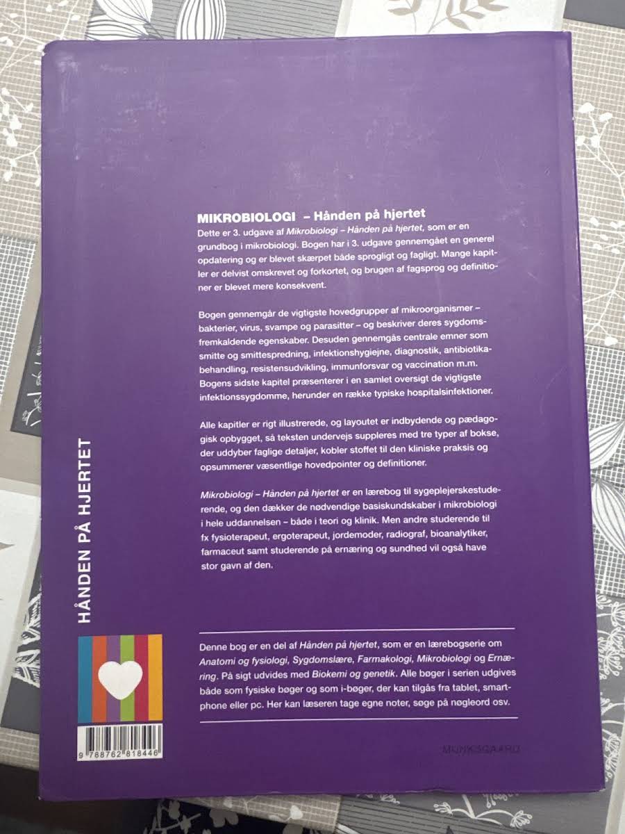 I 3. udgave af Mikrobiologi – Hånden på hjertet er grundbogen i mikrobiologi blevet gennemgået med en omfattende faglig og sproglig opdatering. Mange kapitler er revideret, forkortet og tilpasset med et mere konsekvent fagsprog, så læseren oplever en strømlinet og moderne tilgang til stoffet. Bogen dykker ned i de væsentligste mikroorganismer – herunder bakterier, virus, svampe og parasitter – og belyser deres rolle i sygdomsprocesser. Centrale temaer som smitte, infektionshygiejne, diagnostik, antibiotikabehandling, resistensudvikling, immunforsvar og vaccination behandles grundigt og præcist. Med et indbydende layout, rige illustrationer og specialdesignede bokse, der både forklarer faglige detaljer, relaterer stoffet til klinisk praksis og fremhæver hovedpointer, bliver bogen en uvurderlig ressource. Den er skræddersyet til sygeplejerskestuderende, men er også relevant for studerende inden for fysioterapi, ergoterapi, jordemoder, radiografi, bioanalytik, farmaci samt ernæring og sundhed.
