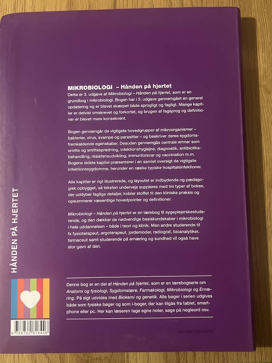 I 3. udgave af Mikrobiologi – Hånden på hjertet er grundbogen i mikrobiologi blevet gennemgået med en omfattende faglig og sproglig opdatering. Mange kapitler er revideret, forkortet og tilpasset med et mere konsekvent fagsprog, så læseren oplever en strømlinet og moderne tilgang til stoffet. Bogen dykker ned i de væsentligste mikroorganismer – herunder bakterier, virus, svampe og parasitter – og belyser deres rolle i sygdomsprocesser. Centrale temaer som smitte, infektionshygiejne, diagnostik, antibiotikabehandling, resistensudvikling, immunforsvar og vaccination behandles grundigt og præcist. Med et indbydende layout, rige illustrationer og specialdesignede bokse, der både forklarer faglige detaljer, relaterer stoffet til klinisk praksis og fremhæver hovedpointer, bliver bogen en uvurderlig ressource. Den er skræddersyet til sygeplejerskestuderende, men er også relevant for studerende inden for fysioterapi, ergoterapi, jordemoder, radiografi, bioanalytik, farmaci samt ernæring og sundhed.