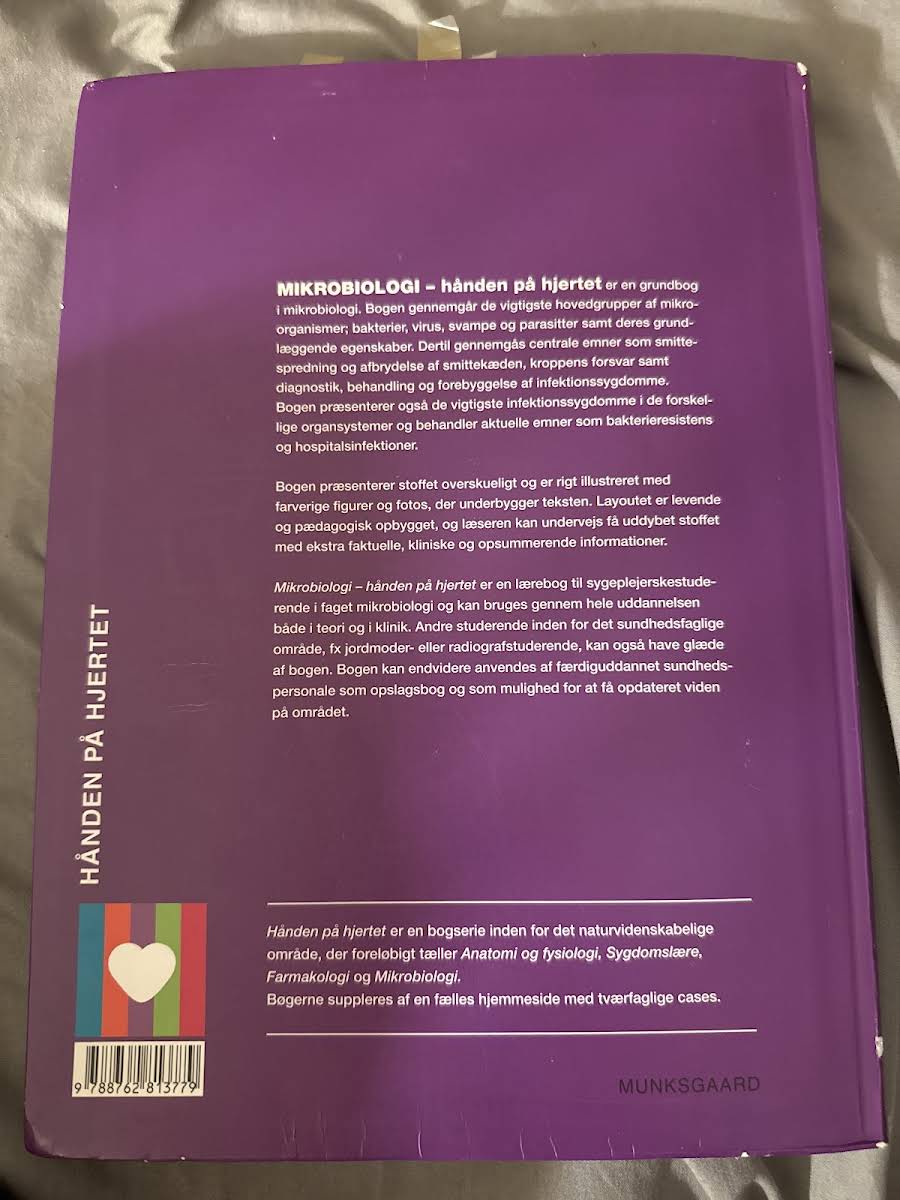 Mikrobiologi – hånden på hjertet er en grundbog i mikrobiologi, der giver et klart overblik over de forskellige mikroorganismer som bakterier, virus, svampe og parasitter samt deres egenskaber. Bogen dykker endvidere ned i, hvordan smitninger opstår og kan brydes, hvordan kroppens forsvar fungerer, samt diagnostik, behandling og forebyggelse af infektionssygdomme. Med et levende layout og rige farverige illustrationer bliver stoffet gjort tilgængeligt og overskueligt. Bogen supplerer den traditionelle tekst med ekstra kliniske og faktuelle indspark samt opsummerende informationer, der giver læseren mulighed for en dybere forståelse af emnerne. Den digitale version indeholder desuden opgaver, animationer, quizzer og en notesbog, der bidrager til en varieret tilgang til læring. Mikrobiologi – hånden på hjertet retter sig primært mod sygeplejerskestuderende, men er også ideel for andre studerende inden for sundhedsfaglige områder samt for færdiguddannet sundhedspersonale, der ønsker at opdatere deres viden. Denne titel fra 2014, udgivet af Gyldendal, står som et uundværligt redskab i studiet af mikrobiologi med et pedagogisk touch, der både fastholder og udfordrer læseren.
