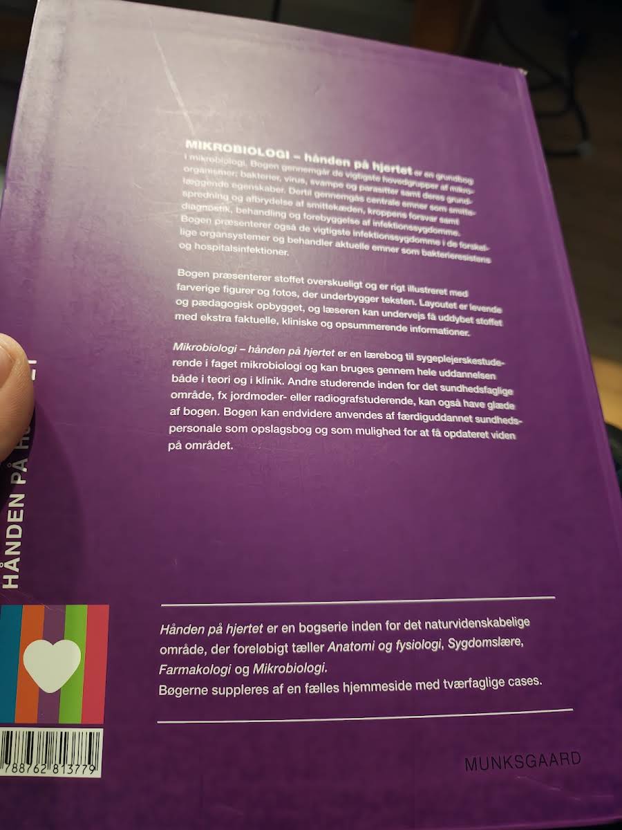Mikrobiologi – hånden på hjertet er en grundbog i mikrobiologi, der giver et klart overblik over de forskellige mikroorganismer som bakterier, virus, svampe og parasitter samt deres egenskaber. Bogen dykker endvidere ned i, hvordan smitninger opstår og kan brydes, hvordan kroppens forsvar fungerer, samt diagnostik, behandling og forebyggelse af infektionssygdomme. Med et levende layout og rige farverige illustrationer bliver stoffet gjort tilgængeligt og overskueligt. Bogen supplerer den traditionelle tekst med ekstra kliniske og faktuelle indspark samt opsummerende informationer, der giver læseren mulighed for en dybere forståelse af emnerne. Den digitale version indeholder desuden opgaver, animationer, quizzer og en notesbog, der bidrager til en varieret tilgang til læring. Mikrobiologi – hånden på hjertet retter sig primært mod sygeplejerskestuderende, men er også ideel for andre studerende inden for sundhedsfaglige områder samt for færdiguddannet sundhedspersonale, der ønsker at opdatere deres viden. Denne titel fra 2014, udgivet af Gyldendal, står som et uundværligt redskab i studiet af mikrobiologi med et pedagogisk touch, der både fastholder og udfordrer læseren.