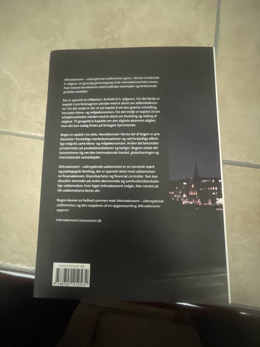 En teoretisk velfunderet og pædagogisk opbygget lærebog i mikroøkonomi, skrevet af Hans Jørgen Biede og målrettet videregående uddannelser som finansøkonom, finansbachelor og financial controller. Den er samtidig velegnet på andre økonomiske og samfundsvidenskabelige uddannelser, herunder HD-uddannelsens første del. I denne 6. udgave præsenteres mikroøkonomiens centrale teorier i samspil med illustrative eksempler og klare grafiske modeller. Bogen er inddelt i tre overordnede dele: Første del omhandler prisdannelse under forskellige markedsstrukturer og offentlige indgreb samt klima- og miljøøkonomi. Anden del fokuserer på prisfastsættelse af produktionsfaktorer og boligmarkedet, mens tredje del tager fat på international handel, globalisering og internationale samarbejder. Sammenlignet med 5. udgave rummer denne udgave tre væsentlige nyheder: Kapitel 3 om forbrugeradfærd er udvidet med et afsnit om adfærdsøkonomi, kapitel 8 introducerer et helt nyt emne om den grønne omstilling med klima- og miljøøkonomiske perspektiver, og kapitel 10 om arbejdsmarkedet indeholder nu analyser af fordeling og ulighedsmåling. Det tidligere kapitel om digital økonomi er til gengæld udgået. Mikroøkonomi - videregående uddannelser står i naturlig forlængelse af Makroøkonomi - videregående uddannelser og kan yderligere understøttes af opgavesamlingen Mikroøkonomi - opgaver.