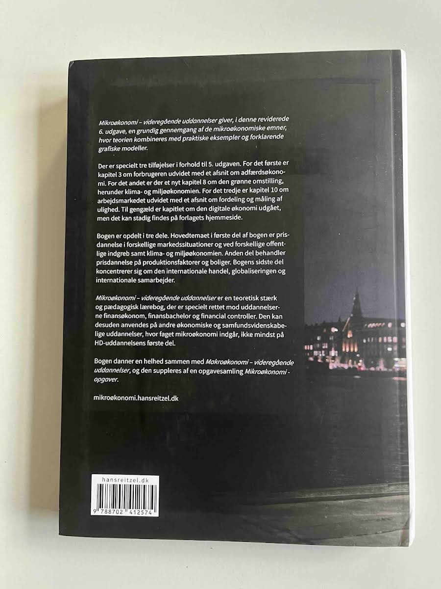 En teoretisk velfunderet og pædagogisk opbygget lærebog i mikroøkonomi, skrevet af Hans Jørgen Biede og målrettet videregående uddannelser som finansøkonom, finansbachelor og financial controller. Den er samtidig velegnet på andre økonomiske og samfundsvidenskabelige uddannelser, herunder HD-uddannelsens første del. I denne 6. udgave præsenteres mikroøkonomiens centrale teorier i samspil med illustrative eksempler og klare grafiske modeller. Bogen er inddelt i tre overordnede dele: Første del omhandler prisdannelse under forskellige markedsstrukturer og offentlige indgreb samt klima- og miljøøkonomi. Anden del fokuserer på prisfastsættelse af produktionsfaktorer og boligmarkedet, mens tredje del tager fat på international handel, globalisering og internationale samarbejder. Sammenlignet med 5. udgave rummer denne udgave tre væsentlige nyheder: Kapitel 3 om forbrugeradfærd er udvidet med et afsnit om adfærdsøkonomi, kapitel 8 introducerer et helt nyt emne om den grønne omstilling med klima- og miljøøkonomiske perspektiver, og kapitel 10 om arbejdsmarkedet indeholder nu analyser af fordeling og ulighedsmåling. Det tidligere kapitel om digital økonomi er til gengæld udgået. Mikroøkonomi - videregående uddannelser står i naturlig forlængelse af Makroøkonomi - videregående uddannelser og kan yderligere understøttes af opgavesamlingen Mikroøkonomi - opgaver.