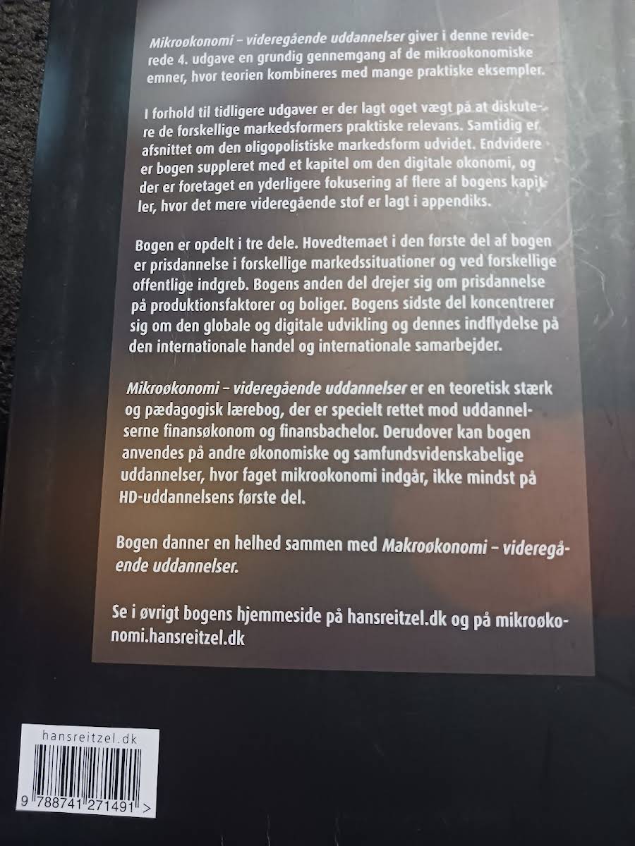 Mikroøkonomi er en grundigt opdateret lærebog, der kombinerer teoretiske modeller med virkelighedsnære eksempler for at give læseren en dybdegående forståelse af mikroeconomiske processer. Bogen anvender forklarende grafiske fremstillinger og simple matematiske beregninger for at illustrere, hvordan priser dannes under forskellige markedssituationer og ved offentlige indgreb. I den fjerde udgave er der lagt øget vægt på de markedsformer, som har praktisk betydning, med en særlig udvidet dækning af den oligopolistiske situation. Desuden er et helt nyt kapitel om den digitale økonomi integreret, hvilket understreger den hastigt voksende rolle, digitaliseringen spiller i dagens samfundsøkonomi. Bogen er struktureret i tre dele, hvor den første sektion omhandler prisdannelse, mens de efterfølgende dele behandler prisfastsættelsen på produktionsfaktorer og boliger samt den globale økonomis indflydelse på international handel og samarbejde. Mikroøkonomi er et solidt og pædagogisk redskab, som henvender sig til studerende på videregående uddannelser med fokus på finansøkonomi og beslægtede fagområder.