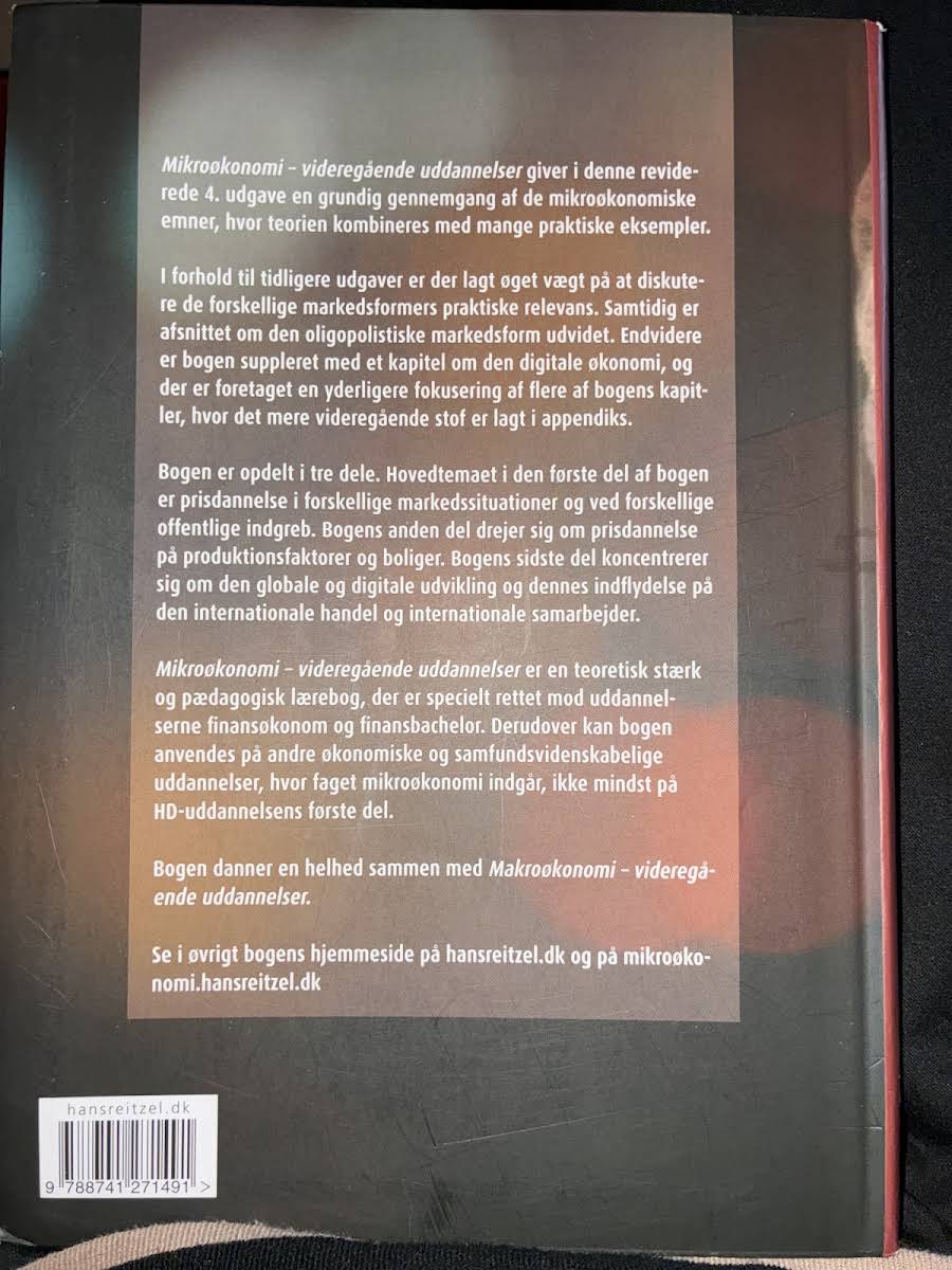 Mikroøkonomi er en grundigt opdateret lærebog, der kombinerer teoretiske modeller med virkelighedsnære eksempler for at give læseren en dybdegående forståelse af mikroeconomiske processer. Bogen anvender forklarende grafiske fremstillinger og simple matematiske beregninger for at illustrere, hvordan priser dannes under forskellige markedssituationer og ved offentlige indgreb. I den fjerde udgave er der lagt øget vægt på de markedsformer, som har praktisk betydning, med en særlig udvidet dækning af den oligopolistiske situation. Desuden er et helt nyt kapitel om den digitale økonomi integreret, hvilket understreger den hastigt voksende rolle, digitaliseringen spiller i dagens samfundsøkonomi. Bogen er struktureret i tre dele, hvor den første sektion omhandler prisdannelse, mens de efterfølgende dele behandler prisfastsættelsen på produktionsfaktorer og boliger samt den globale økonomis indflydelse på international handel og samarbejde. Mikroøkonomi er et solidt og pædagogisk redskab, som henvender sig til studerende på videregående uddannelser med fokus på finansøkonomi og beslægtede fagområder.
