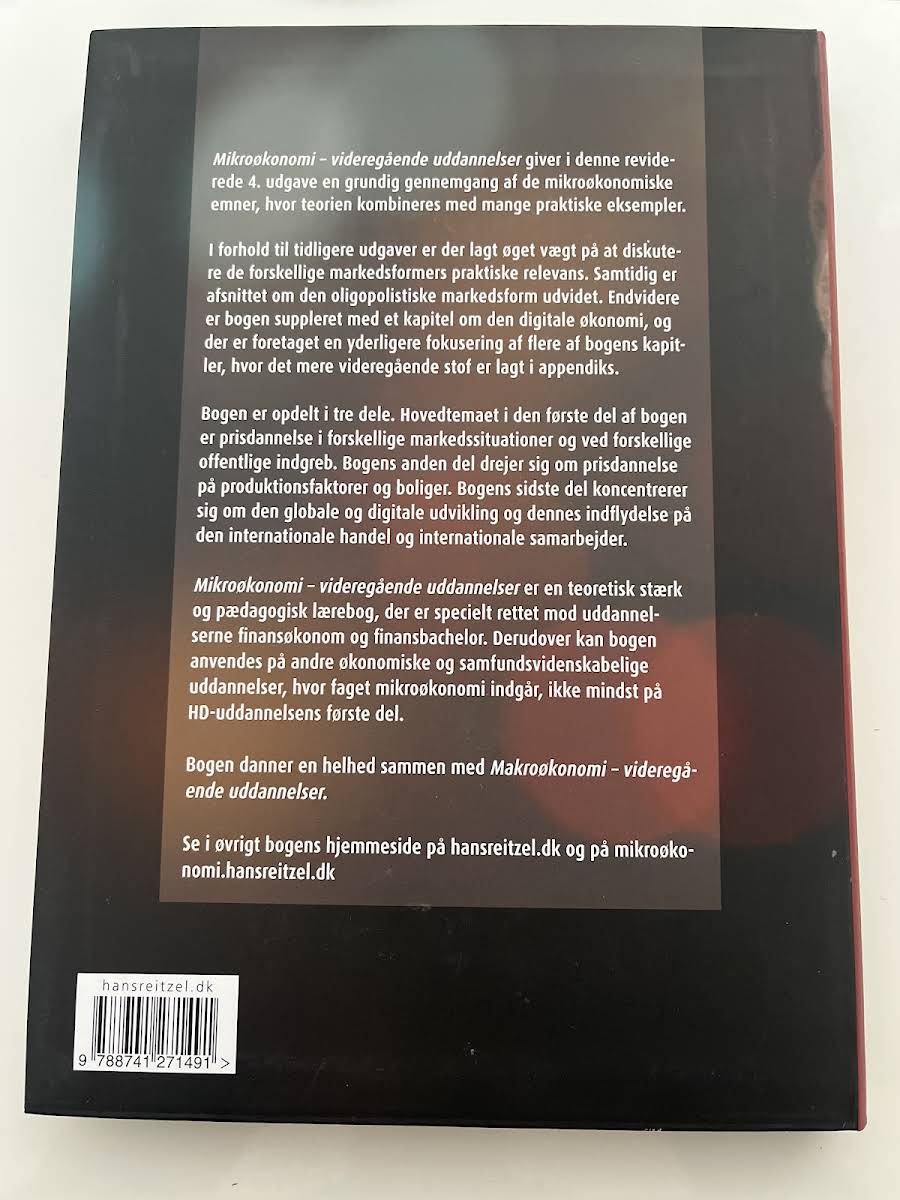 Mikroøkonomi er en grundigt opdateret lærebog, der kombinerer teoretiske modeller med virkelighedsnære eksempler for at give læseren en dybdegående forståelse af mikroeconomiske processer. Bogen anvender forklarende grafiske fremstillinger og simple matematiske beregninger for at illustrere, hvordan priser dannes under forskellige markedssituationer og ved offentlige indgreb. I den fjerde udgave er der lagt øget vægt på de markedsformer, som har praktisk betydning, med en særlig udvidet dækning af den oligopolistiske situation. Desuden er et helt nyt kapitel om den digitale økonomi integreret, hvilket understreger den hastigt voksende rolle, digitaliseringen spiller i dagens samfundsøkonomi. Bogen er struktureret i tre dele, hvor den første sektion omhandler prisdannelse, mens de efterfølgende dele behandler prisfastsættelsen på produktionsfaktorer og boliger samt den globale økonomis indflydelse på international handel og samarbejde. Mikroøkonomi er et solidt og pædagogisk redskab, som henvender sig til studerende på videregående uddannelser med fokus på finansøkonomi og beslægtede fagområder.