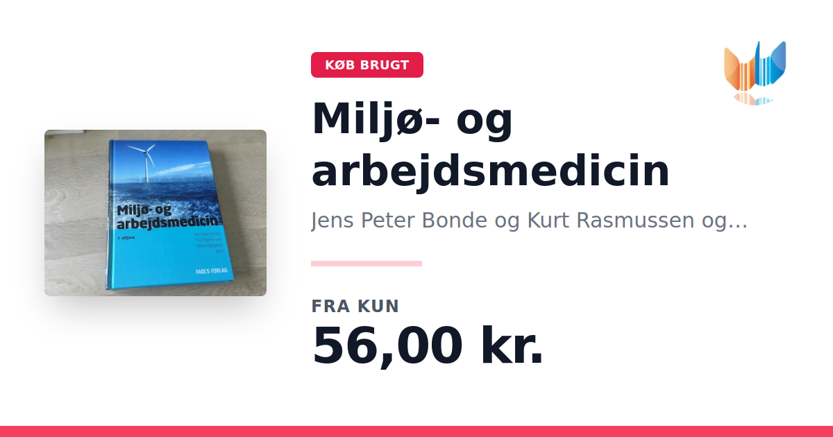 Lige nu kan du købe "Miljø- og arbejdsmedicin" af Jens Peter Bonde og Kurt Rasmussen og Torben Sigsgaard til kun 56,00 kr. Bogen du ser her er brugt, og i god stand. Vi har i øjeblikket kun et enkelt eksemplar til salg af "Miljø- og arbejdsmedicin", så slå til mens du kan!