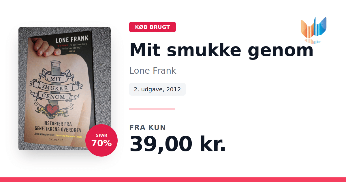 Lige nu kan du købe "Mit smukke genom" af Lone Frank til kun 39,00 kr. Du sparer hele 70% af nyprisen! Bogen du ser her er brugt, og i god stand. Vi har i øjeblikket kun et enkelt eksemplar til salg af "Mit smukke genom", så slå til mens du kan!