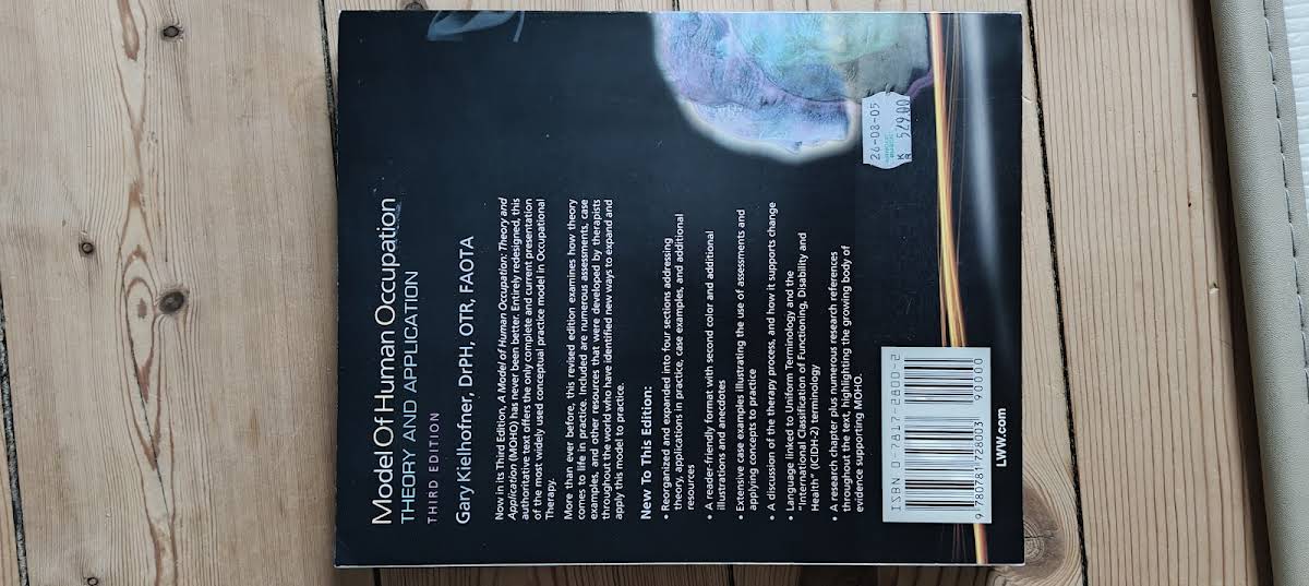 A Model of Human Occupation: Theory and Application er en grundlæggende præsentation af det mest anvendte begrebsmæssige rammeværk i ergoterapi. Bogen beskriver indgående, hvordan menneskelig aktivitet formes af både individuelle, sociale og miljømæssige faktorer, og lægger vægt på både teoretisk forståelse og praktisk anvendelse. Denne paperbackudgave fra 2002 fra Lippincott Williams & Wilkins er omhyggelig revideret og tilbyder en mere overskuelig opbygning med to-farvet layout og nye illustrationer. Der er tilføjet flere kliniske casestudier, som viser modellens anvendelse i forskellige praksissammenhænge, samt en udbygget diskussion af forandringsprocessen i terapi. Endvidere introduceres et nyt kapitel om forskningsresultater med et omfattende referenceliste, der dokumenterer den voksende evidens for MOHO’s effektivitet. A Model of Human Occupation giver ergoterapeuter, studerende og forskere et solidt værktøj til at forstå, planlægge og evaluere menneskers aktivitet og deltagelse.