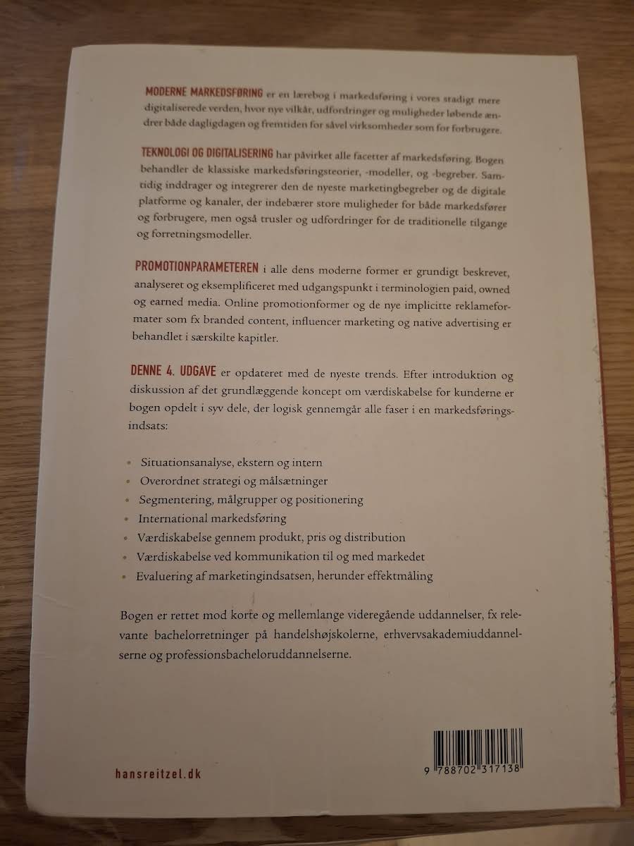MODERNE MARKEDSFØRING er en omfattende lærebog, der belyser markedsføringens udvikling i en digitaliseret tidsalder, hvor teknologiske fremskridt og nye digitale platforme ændrer betingelserne for både virksomheder og forbrugere. Bogen præsenterer de klassiske markedsføringsteorier og -modeller, samtidig med at den inddrager de nyeste digitale strategier og begreber, der former nutidens marked. Med fokus på både traditionelle og moderne tilgange gennemgår værket markedets mange facetter, herunder strategisk planlægning, segmentering og positionering samt de forskellige online promotionformer. Diskussionen om paid, owned og earned media suppleret med eksempler på branded content, influencer marketing og native advertising giver læseren en dybdegående forståelse af, hvordan digitale kanaler kan integreres i en overordnet markedsføringsstrategi. Efter en grundig introduktion til værdiskabelsen for kunderne opdeler bogen emnet i logiske faser, der dækker alt fra situationsanalyse og målsætninger til implementering og evaluering af marketingindsatsen. Denne strukturerede tilgang gør den ideel til studerende på korte og mellemlange videregående uddannelser, særlig inden for bachelor- og professionsbachelorprogrammer på handelshøjskoler og erhvervsakademier.