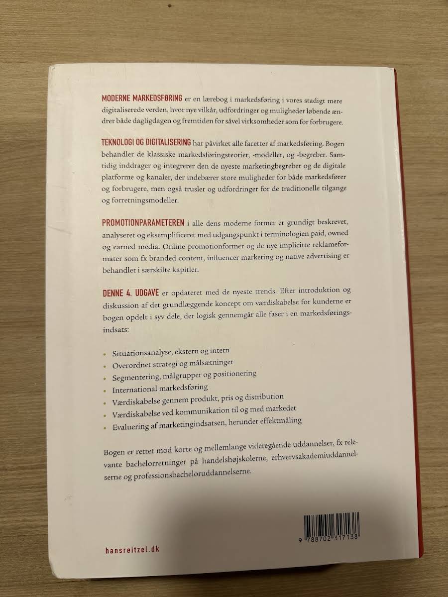 MODERNE MARKEDSFØRING er en omfattende lærebog, der belyser markedsføringens udvikling i en digitaliseret tidsalder, hvor teknologiske fremskridt og nye digitale platforme ændrer betingelserne for både virksomheder og forbrugere. Bogen præsenterer de klassiske markedsføringsteorier og -modeller, samtidig med at den inddrager de nyeste digitale strategier og begreber, der former nutidens marked. Med fokus på både traditionelle og moderne tilgange gennemgår værket markedets mange facetter, herunder strategisk planlægning, segmentering og positionering samt de forskellige online promotionformer. Diskussionen om paid, owned og earned media suppleret med eksempler på branded content, influencer marketing og native advertising giver læseren en dybdegående forståelse af, hvordan digitale kanaler kan integreres i en overordnet markedsføringsstrategi. Efter en grundig introduktion til værdiskabelsen for kunderne opdeler bogen emnet i logiske faser, der dækker alt fra situationsanalyse og målsætninger til implementering og evaluering af marketingindsatsen. Denne strukturerede tilgang gør den ideel til studerende på korte og mellemlange videregående uddannelser, særlig inden for bachelor- og professionsbachelorprogrammer på handelshøjskoler og erhvervsakademier.