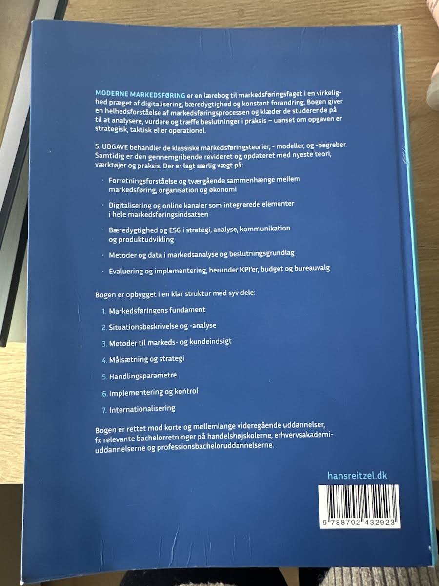 Moderne markedsføring er en lærebog, der klæder de studerende på til at navigere i en verden præget af digitalisering, bæredygtighed og konstant forandring. Den henvender sig til korte og mellemlange videregående uddannelser, fx bachelorretninger på handelshøjskoler, erhvervsakademi- og professionsbacheloruddannelser. Bogen skaber en helhedsforståelse af markedsføringsprocessen og træner læseren i at analysere, vurdere og træffe beslutninger - uanset om perspektivet er strategisk, taktisk eller operationelt. 5. udgave er gennemgribende revideret og opdateret med nyeste teori, værktøjer og cases, med særlig fokus på: • Digitalisering og online kanaler som integrerede elementer i markedsføringsindsatsen • Bæredygtighed og ESG i strategi, analyse, kommunikation og produktudvikling • Forretningsforståelse og sammenhænge mellem markedsføring, organisation og økonomi • Øget vægt på metoder og data i markedsanalyse og beslutningsgrundlag • Evaluering og implementering, herunder KPI’er, budget og bureauvalg Bogen er opbygget i syv dele: 1. Markedsføringens grundlag 2. Situationsanalyse 3. Markeds- og kundeindsigt 4. Strategi og målgrupper 5. Handlingsparametre 6. Implementering og kontrol 7. Internationalisering
