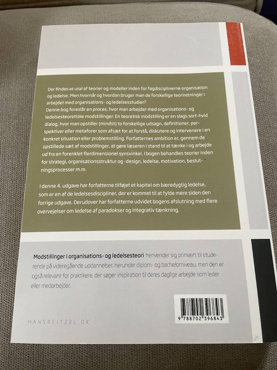 Der findes en lang række teorier og modeller inden for organisation og ledelse, men hvordan anvender man dem bedst i praksis? I denne bog introduceres en metode, der arbejder med organisations- og ledelsesteoretiske modstillinger – en form for dialog, hvor to eller flere perspektiver, definitioner eller metaforer sættes op mod hinanden. Metoden giver læseren redskaber til at anskue komplekse problemstillinger ud fra et mere nuanceret, flerdimensionelt perspektiv. I "Modstillinger i organisations- og ledelsesteori" behandles emner som strategi, organisationsstruktur, ledelse, motivation og beslutningsprocesser. I 4. udgave fra 2023 er der desuden tilføjet et kapitel om bæredygtig ledelse, hvilket afspejler ledelsesdiscipliner, der i stigende grad får opmærksomhed. Desuden er bogen udvidet med yderligere refleksioner om håndtering af paradokser og integrativ tænkning. Uanset om du er studerende eller praktikant, tilbyder denne bog inspirerende indsigter til både akademisk studie og daglig ledelsespraksis.