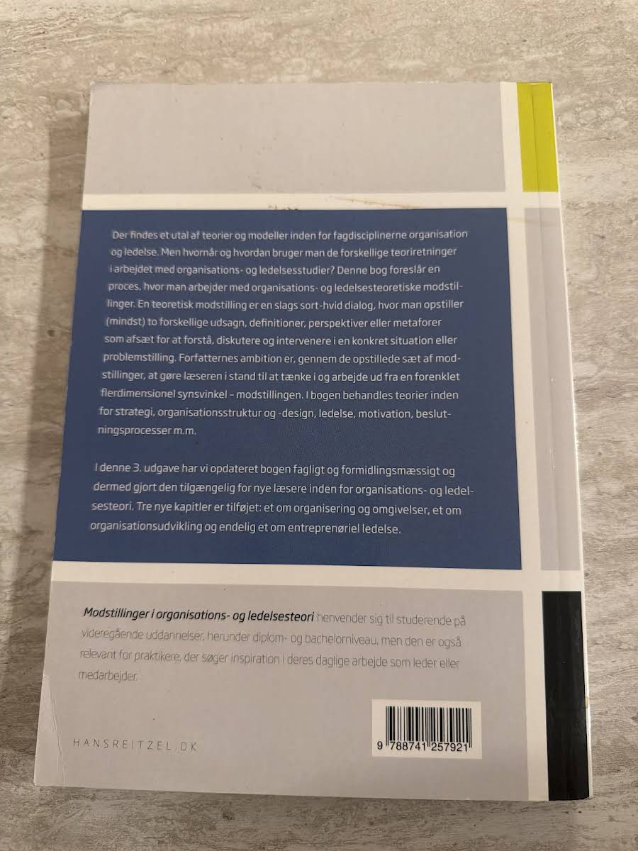 Inden for organisation og ledelse findes et væld af teorier og modeller, som ofte kan virke modsatrettede eller komplementære. I "Modstillinger i organisations- og ledelsesteori" præsenteres en tilgang, der understreger den teoretiske modstilling – en metodik, hvor minimum to udsagn, definitioner, perspektiver eller metaforer stilles op mod hinanden. Denne sort-hvide dialog giver læseren et redskab til at forstå, diskutere og handle i komplekse problemstillinger. Bogen, der er opdateret i sin tredje udgave (2016) af Gyldendal, behandler centrale emner som strategi, organisationsstruktur, ledelse, motivation og beslutningsprocesser. Ved at arbejde med de opstillede modstillinger bliver læseren opfordret til at tænke i en forenklet flerdimensionel ramme, som kan anvendes både i studier og praktisk ledelsesarbejde. Yderligere er der i denne udgave tilføjet nye kapitler om organisering og omgivelser, organisationsudvikling samt entreprenøriel ledelse, hvilket gør bogen relevant for både studerende og praktikere.