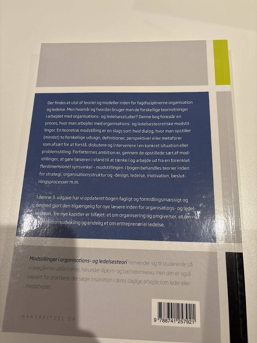 Inden for organisation og ledelse findes et væld af teorier og modeller, som ofte kan virke modsatrettede eller komplementære. I "Modstillinger i organisations- og ledelsesteori" præsenteres en tilgang, der understreger den teoretiske modstilling – en metodik, hvor minimum to udsagn, definitioner, perspektiver eller metaforer stilles op mod hinanden. Denne sort-hvide dialog giver læseren et redskab til at forstå, diskutere og handle i komplekse problemstillinger. Bogen, der er opdateret i sin tredje udgave (2016) af Gyldendal, behandler centrale emner som strategi, organisationsstruktur, ledelse, motivation og beslutningsprocesser. Ved at arbejde med de opstillede modstillinger bliver læseren opfordret til at tænke i en forenklet flerdimensionel ramme, som kan anvendes både i studier og praktisk ledelsesarbejde. Yderligere er der i denne udgave tilføjet nye kapitler om organisering og omgivelser, organisationsudvikling samt entreprenøriel ledelse, hvilket gør bogen relevant for både studerende og praktikere.