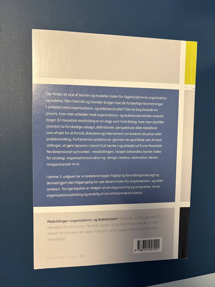 Inden for organisation og ledelse findes et væld af teorier og modeller, som ofte kan virke modsatrettede eller komplementære. I "Modstillinger i organisations- og ledelsesteori" præsenteres en tilgang, der understreger den teoretiske modstilling – en metodik, hvor minimum to udsagn, definitioner, perspektiver eller metaforer stilles op mod hinanden. Denne sort-hvide dialog giver læseren et redskab til at forstå, diskutere og handle i komplekse problemstillinger. Bogen, der er opdateret i sin tredje udgave (2016) af Gyldendal, behandler centrale emner som strategi, organisationsstruktur, ledelse, motivation og beslutningsprocesser. Ved at arbejde med de opstillede modstillinger bliver læseren opfordret til at tænke i en forenklet flerdimensionel ramme, som kan anvendes både i studier og praktisk ledelsesarbejde. Yderligere er der i denne udgave tilføjet nye kapitler om organisering og omgivelser, organisationsudvikling samt entreprenøriel ledelse, hvilket gør bogen relevant for både studerende og praktikere.