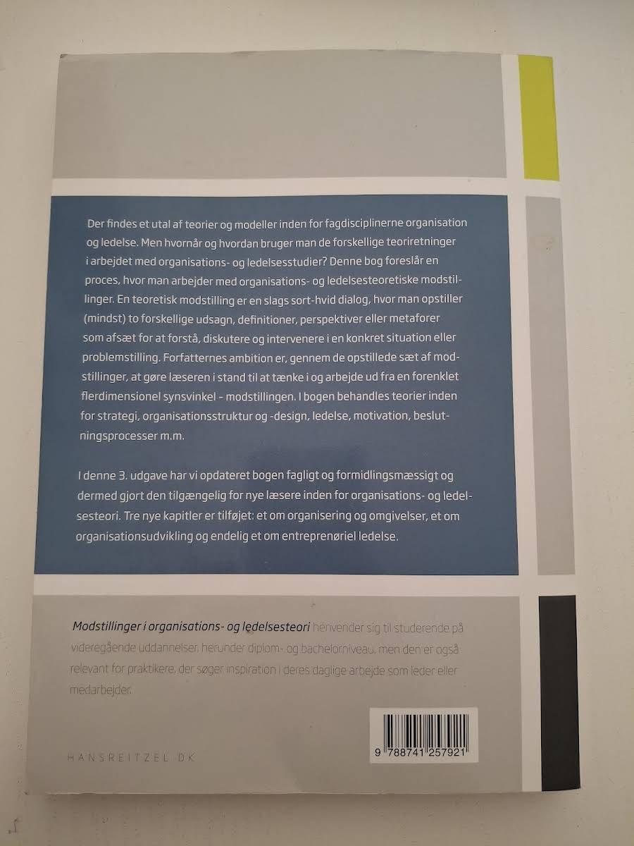 Inden for organisation og ledelse findes et væld af teorier og modeller, som ofte kan virke modsatrettede eller komplementære. I "Modstillinger i organisations- og ledelsesteori" præsenteres en tilgang, der understreger den teoretiske modstilling – en metodik, hvor minimum to udsagn, definitioner, perspektiver eller metaforer stilles op mod hinanden. Denne sort-hvide dialog giver læseren et redskab til at forstå, diskutere og handle i komplekse problemstillinger. Bogen, der er opdateret i sin tredje udgave (2016) af Gyldendal, behandler centrale emner som strategi, organisationsstruktur, ledelse, motivation og beslutningsprocesser. Ved at arbejde med de opstillede modstillinger bliver læseren opfordret til at tænke i en forenklet flerdimensionel ramme, som kan anvendes både i studier og praktisk ledelsesarbejde. Yderligere er der i denne udgave tilføjet nye kapitler om organisering og omgivelser, organisationsudvikling samt entreprenøriel ledelse, hvilket gør bogen relevant for både studerende og praktikere.