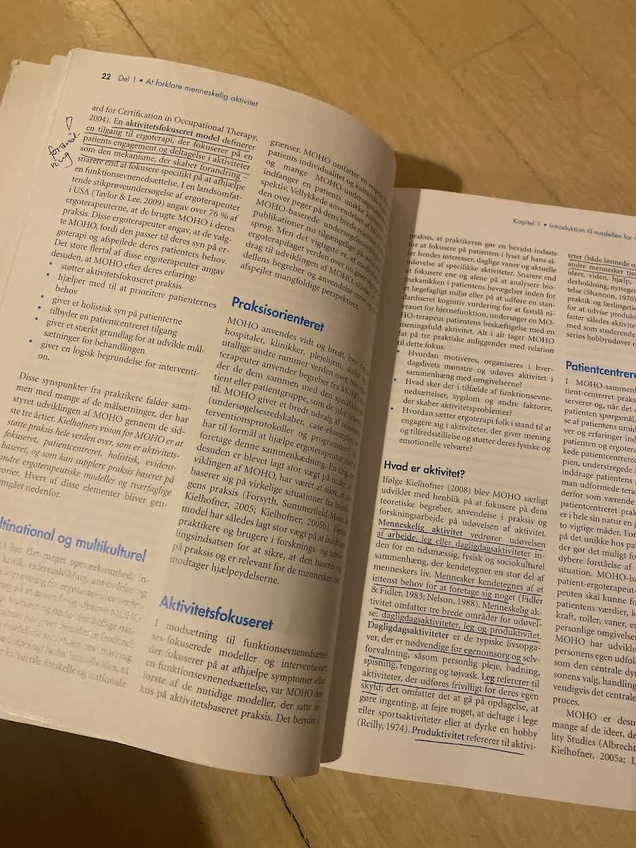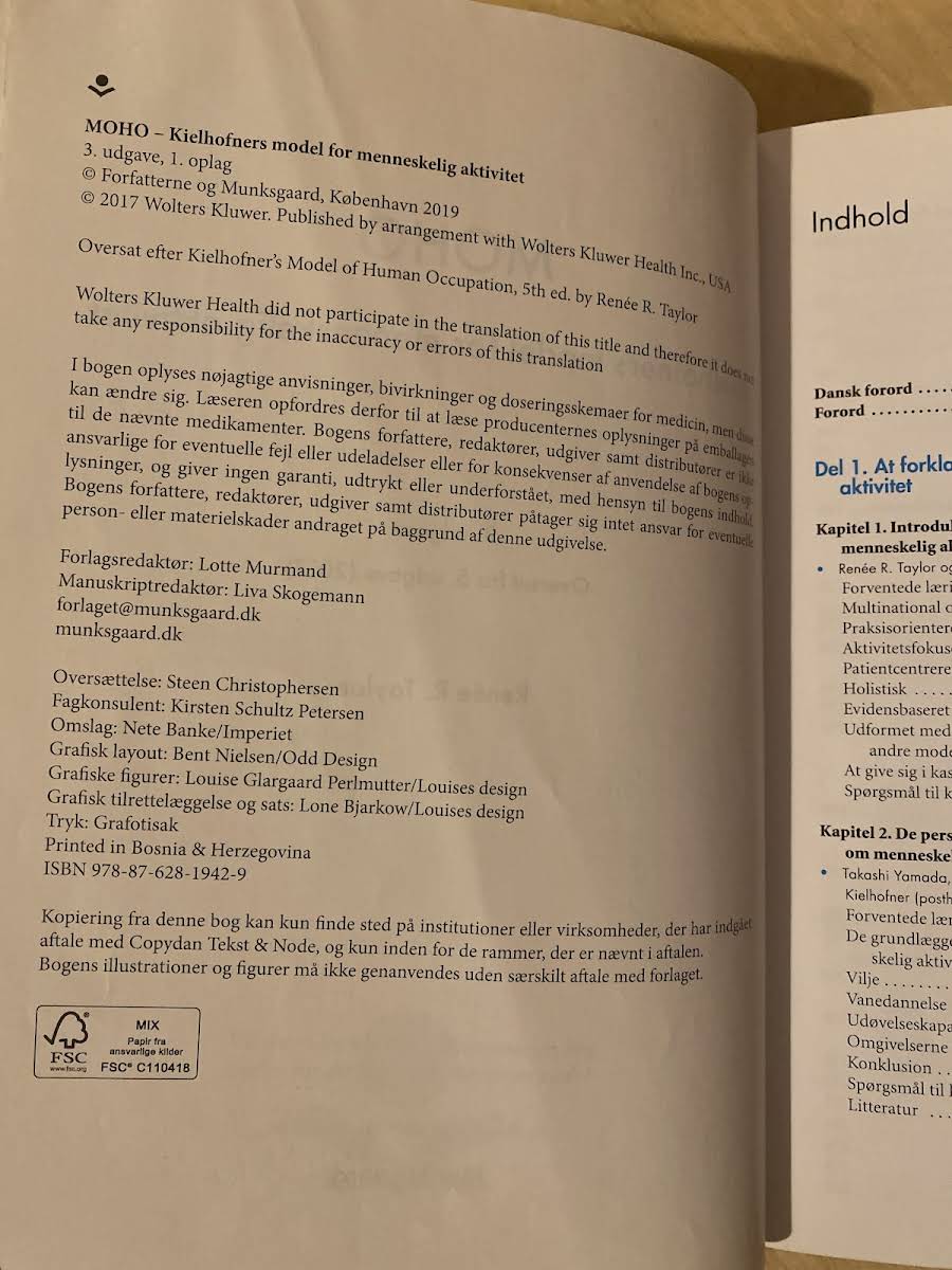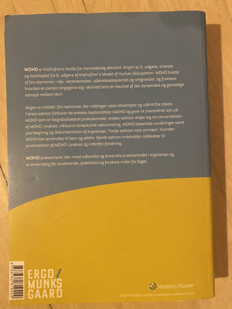 MOHO er Kielhofners model for menneskelig aktivitet, struktureret omkring de fire nøgleelementer: vilje, vanedannelse, udøvelseskapacitet og omgivelser. Denne 3. udgave, oversat og bearbejdet fra den 5. udgave af Kielhofner's Model of Human Occupation, giver et solidt teoretisk udgangspunkt for forståelsen af, hvordan mennesker engagerer sig i aktiviteter gennem et komplekst samspil mellem de nævnte elementer. Bogen er inddelt i fire afsnit, der kombinerer teori med praktiske eksempler og cases. Det første afsnit redegør for de enkelte bestanddele og det overordnede koncept, mens det andet afsnit fokuserer på den praktiske anvendelse i form af terapeutisk ræsonnering, MOHO-baserede vurderinger samt planlægning og dokumentation af ergoterapi. Tredje afsnit belyser modellens anvendelse hos både børn og ældre, mens det fjerde afsnit rummer redskaber, der understøtter både klinisk praksis og forskning. Denne bog er et uvurderligt redskab for studerende, praktikere og forskere inden for ergoterapi.