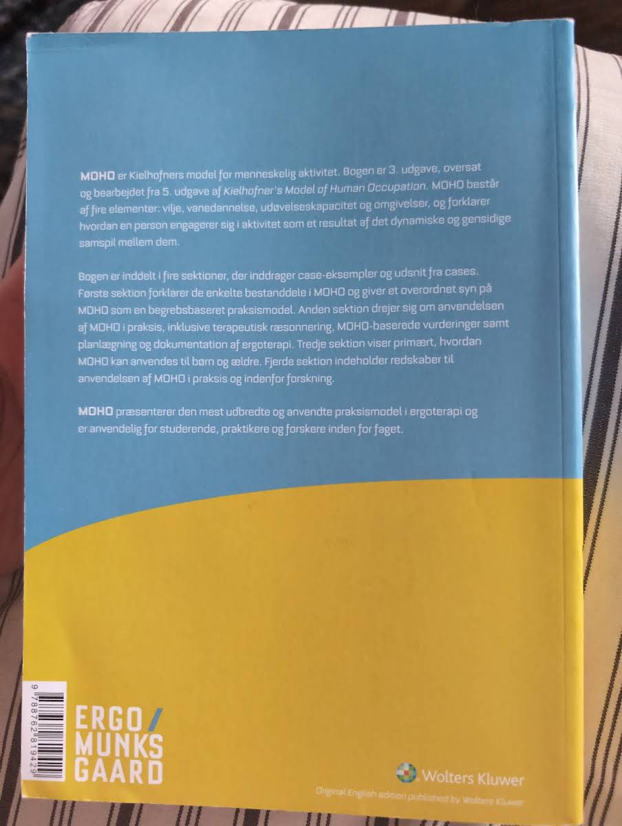 MOHO er Kielhofners model for menneskelig aktivitet, struktureret omkring de fire nøgleelementer: vilje, vanedannelse, udøvelseskapacitet og omgivelser. Denne 3. udgave, oversat og bearbejdet fra den 5. udgave af Kielhofner's Model of Human Occupation, giver et solidt teoretisk udgangspunkt for forståelsen af, hvordan mennesker engagerer sig i aktiviteter gennem et komplekst samspil mellem de nævnte elementer. Bogen er inddelt i fire afsnit, der kombinerer teori med praktiske eksempler og cases. Det første afsnit redegør for de enkelte bestanddele og det overordnede koncept, mens det andet afsnit fokuserer på den praktiske anvendelse i form af terapeutisk ræsonnering, MOHO-baserede vurderinger samt planlægning og dokumentation af ergoterapi. Tredje afsnit belyser modellens anvendelse hos både børn og ældre, mens det fjerde afsnit rummer redskaber, der understøtter både klinisk praksis og forskning. Denne bog er et uvurderligt redskab for studerende, praktikere og forskere inden for ergoterapi.