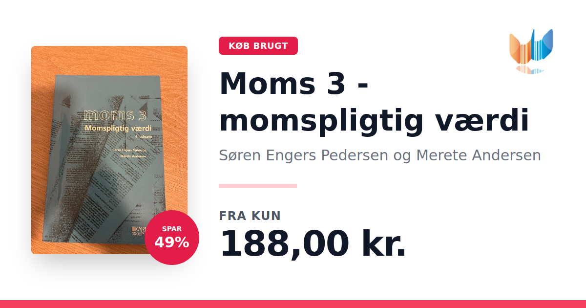 Lige nu kan du købe "Moms 3 - momspligtig værdi" af Søren Engers Pedersen og Merete Andersen til kun 188,00 kr. Du sparer hele 49% af nyprisen! Bogen du ser her er brugt, og i perfekt stand. Vi har i øjeblikket kun et enkelt eksemplar til salg af "Moms 3 - momspligtig værdi", så slå til mens du kan!