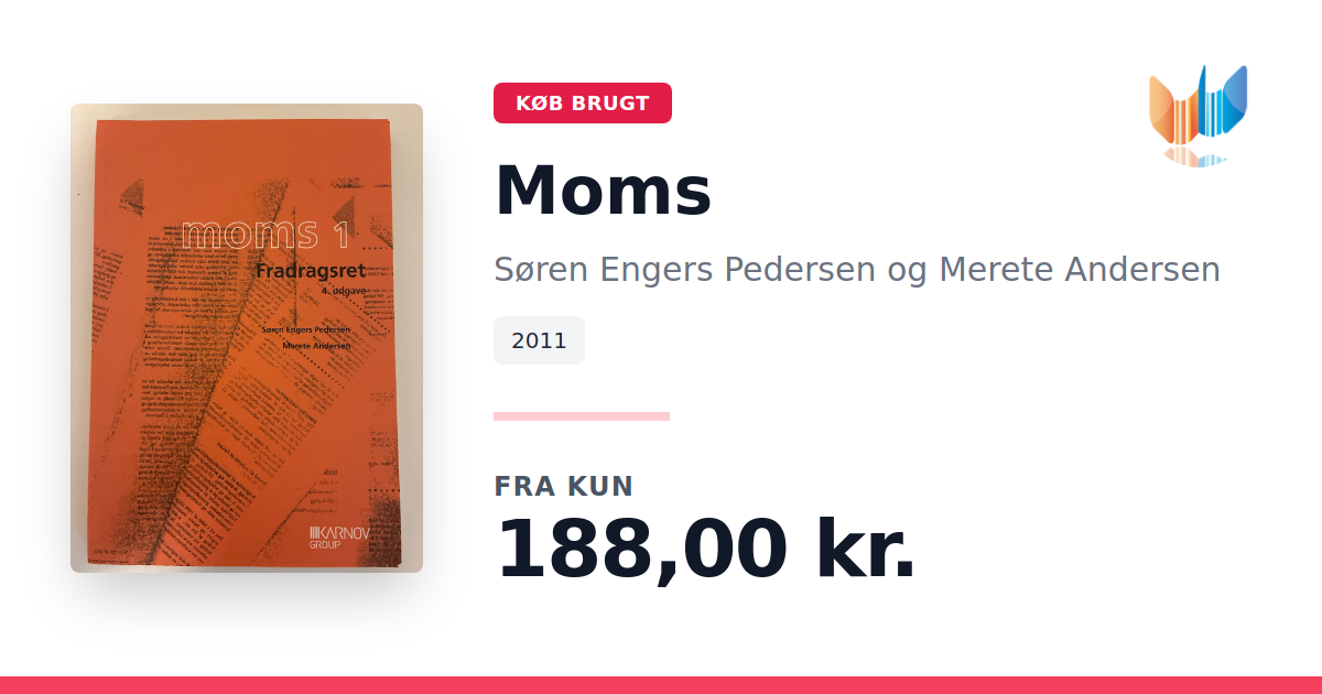 Lige nu kan du købe "Moms" af Søren Engers Pedersen og Merete Andersen til kun 188,00 kr. Bogen du ser her er brugt, og i perfekt stand. Vi har i øjeblikket 2 eksemplarer til salg af "Moms", så husk at se de forskellige udgaver.