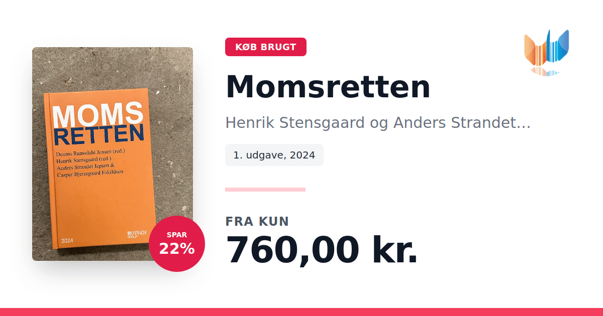 Lige nu kan du købe "Momsretten" af Henrik Stensgaard og Anders Strandet Jepsen til kun 760,00 kr. Du sparer hele 22% af nyprisen! Bogen du ser her er brugt, og i perfekt stand. Vi har i øjeblikket kun et enkelt eksemplar til salg af "Momsretten", så slå til mens du kan!