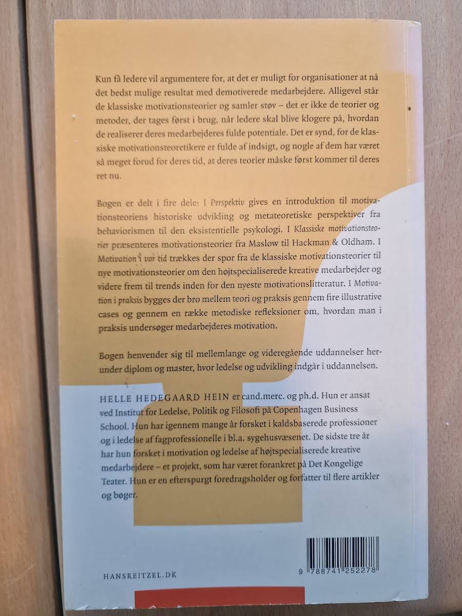 Motivation giver en grundig introduktion til, hvad der menes med motivation, og hvordan de mest centrale teorier forstår og belyser dette begreb. Gennem en systematisk opdeling i fire dele – fra fundamentale perspektiver til både klassiske og moderne teorier – opfordres læseren til at reflektere over de mekanismer, der driver menneskelig adfærd. Bogen kombinerer teoretisk indsigt med praktiske eksempler, hvor cases illustrerer, hvordan forskellige organisationer håndterer udfordringen ved at motivere medarbejdere. Med metodiske overvejelser, der understøtter evnen til at analysere og undersøge motivation både i studier og i lederskab, er værket særligt relevant for studerende og fagfolk inden for personaleledelse og organisationsudvikling. Udgivet i 2009 af Gyldendal og skrevet af Helle Hedegaard Hein, tilbyder denne første udgave et solidt fundament for videre forståelse af motivationsteoris praktiske anvendelse.